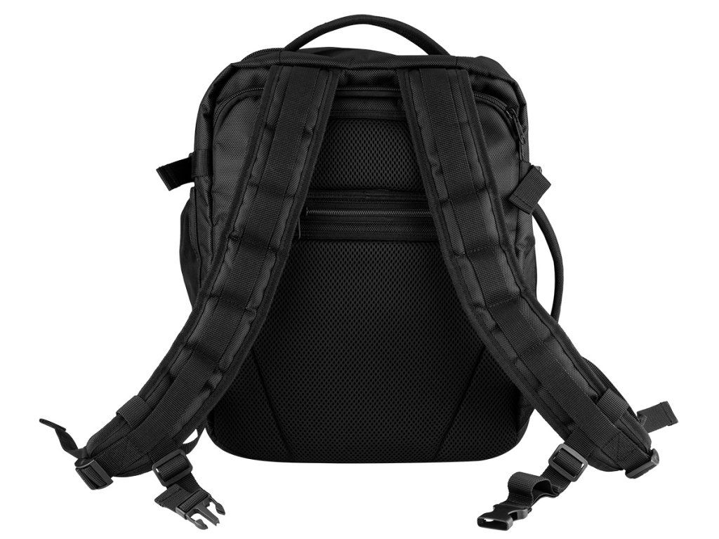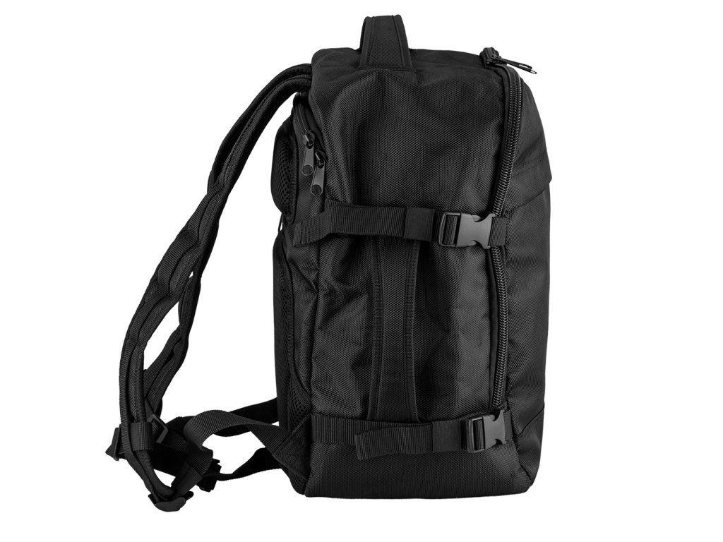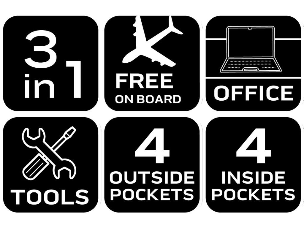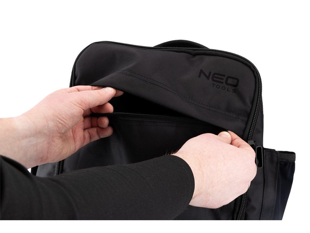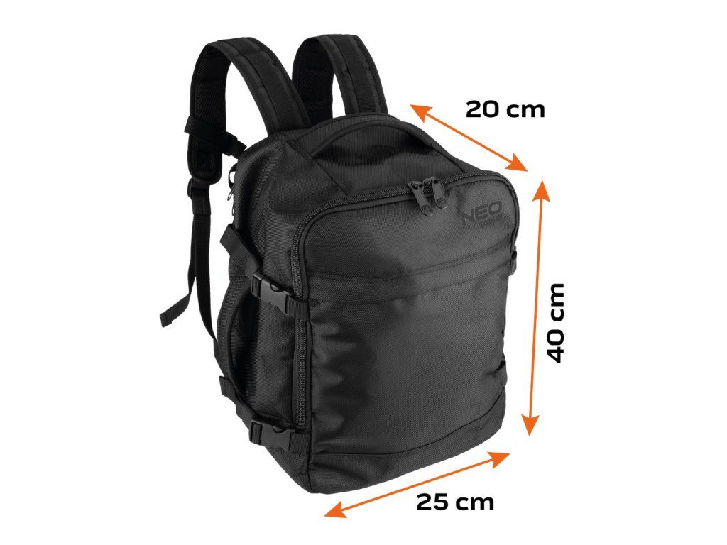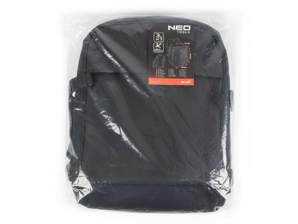 Batoh 3 v 1, 40 x 25 x 20 cm, 84-337 od společnosti NEO TOOLS je černý příruční batoh určený do letadla (Free On Board), do kanceláře a na montážní práce. Jeho rozměry 40 x 25 x 20 cm odpovídají požadavkům na bezplatná příruční zavazadla vybraných leteckých společností. Je vybaven 4 vnějšími kapsami (včetně nastavitelné boční kapsy např. na láhev s vodou a kapsy na dokumenty na zip na zadní straně) a 4 vnitřními kapsami; včetně přihrádky na 15" notebook. Batoh NEO TOOLS má nastavitelné kompresní popruhy, horní a boční madlo a lze jej umístit na rám kufru. Dalším prvkem je logo NEO TOOLS z reflexní nitě.