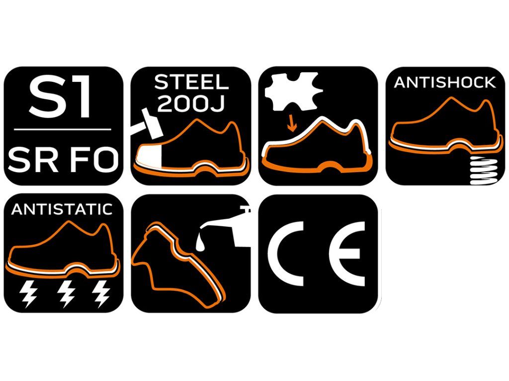 Kožené boty S1 SRC, ocelová špička, velikost 39, 82-165-39 od společnosti NEO jsou pracovní boty třídy S1 SRC s reliéfním svrškem z dělené kůže, kovovými poutky a dvojitým a trojitým prošíváním pro zpevnění konstrukce. Ocelová špička poskytuje ochranu proti nárazům s energií odpovídající 200 J. Boty mají vestavěný podpatek, podrážku ze dvou materiálů a odolnost vůči olejům, benzínu a dalším organickým rozpouštědlům. Vyznačují se antielektrostatickými vlastnostmi. Absorpce energie v patě odpovídá klasifikaci bezpečnostní obuvi podle normy EN ISO 20345. Boty jsou k dispozici v mnoha velikostech.