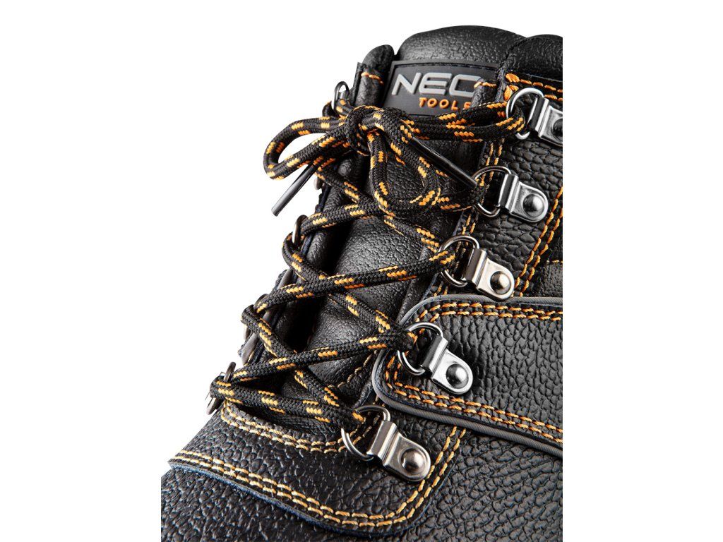 Kožená obuv S3 SRC, ocelová špička, ocelová stélka proti propíchnutí, velikost 44, 82-166-44 od společnosti NEO je pracovní obuv s označením S3 SRC, s reliéfním svrškem z dělené kůže, kovovými poutky a dvojitým a trojitým prošitím pro zpevnění konstrukce. Ocelová špička poskytuje ochranu proti nárazům s energií odpovídající 200 J, zatímco stélka proti propíchnutí ze stejného materiálu chrání spodní část chodidla. Boty mají vestavěný podpatek, podrážku ze dvou materiálů a odolnost vůči olejům, benzínu a dalším organickým rozpouštědlům. Vyznačují se antielektrostatickými vlastnostmi. Vodonepropustnost a absorpce podpatku odpovídá klasifikaci bezpečnostní obuvi podle normy EN ISO 20345. Boty jsou k dispozici v mnoha velikostech.Doplňkové parametry