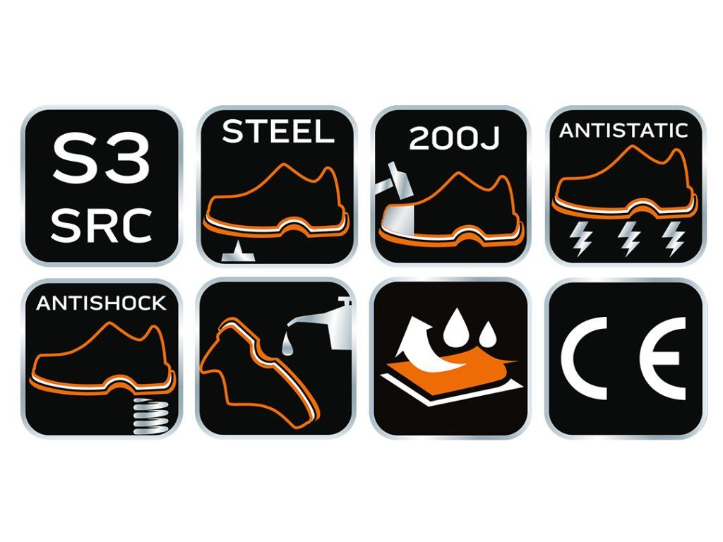 Kožené boty S3 SRC, ocelová špička, ocelová stélka proti propíchnutí, velikost 45, 82-166-45 od společnosti NEO jsou pracovní boty s označením S3 SRC, které mají svršek z reliéfní štípané kůže, kovová poutka a dvojité a trojité prošívání pro zpevnění konstrukce. Ocelová špička poskytuje ochranu proti nárazům s energií odpovídající 200 J, zatímco stélka proti propíchnutí ze stejného materiálu chrání spodní část chodidla. Boty mají vestavěný podpatek, podrážku ze dvou materiálů a odolnost vůči olejům, benzínu a dalším organickým rozpouštědlům. Vyznačují se antielektrostatickými vlastnostmi. Vodonepropustnost a absorpce podpatku odpovídá klasifikaci bezpečnostní obuvi podle normy EN ISO 20345. Boty jsou k dispozici v mnoha velikostech.