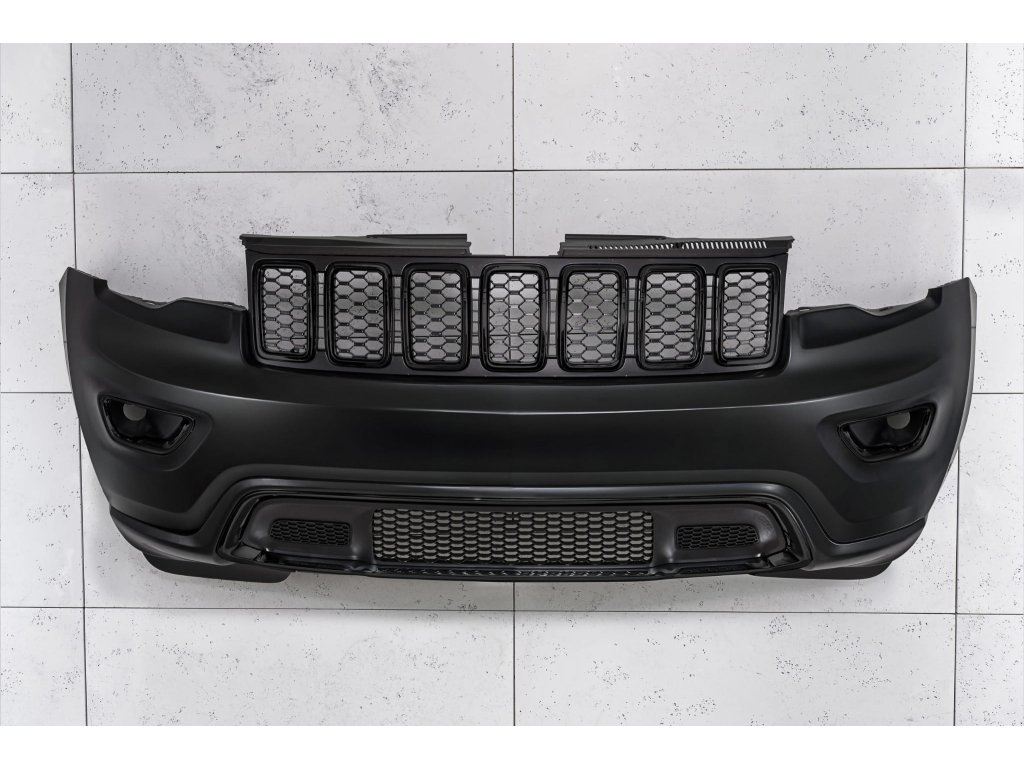 Přední nárazník s černou mřížkou, určený pro JEEP GRAND CHEROKEE IV (WK2) 2017-2021 (druhá faceliftová verze). Verze bez otvorů pro parkovací senzory PDC a bez otvorů pro ostřikovače čelního skla. Vhodné pro verze LAREDO, LIMITED, OVERLAND a TRAILHAWK.