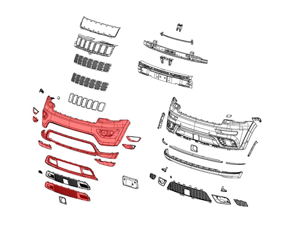 Kompletní přední nárazník určený pro JEEP GRAND CHEROKEE IV (WK2) 2017-2021 (druhá faceliftová verze). Verze bez otvorů pro parkovací senzory PDC a bez otvorů pro ostřikovače čelního skla. Vhodné pro verze LAREDO, LIMITED, OVERLAND a TRAILHAWK. Sada obsahuje: