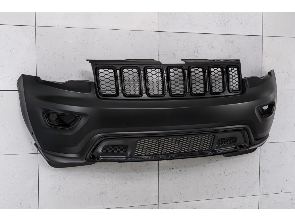 Přední nárazník s černou mřížkou, určený pro JEEP GRAND CHEROKEE IV (WK2) 2017-2021 (druhá faceliftová verze). Verze bez otvorů pro parkovací senzory PDC a bez otvorů pro ostřikovače čelního skla. Vhodné pro verze LAREDO, LIMITED, OVERLAND a TRAILHAWK.