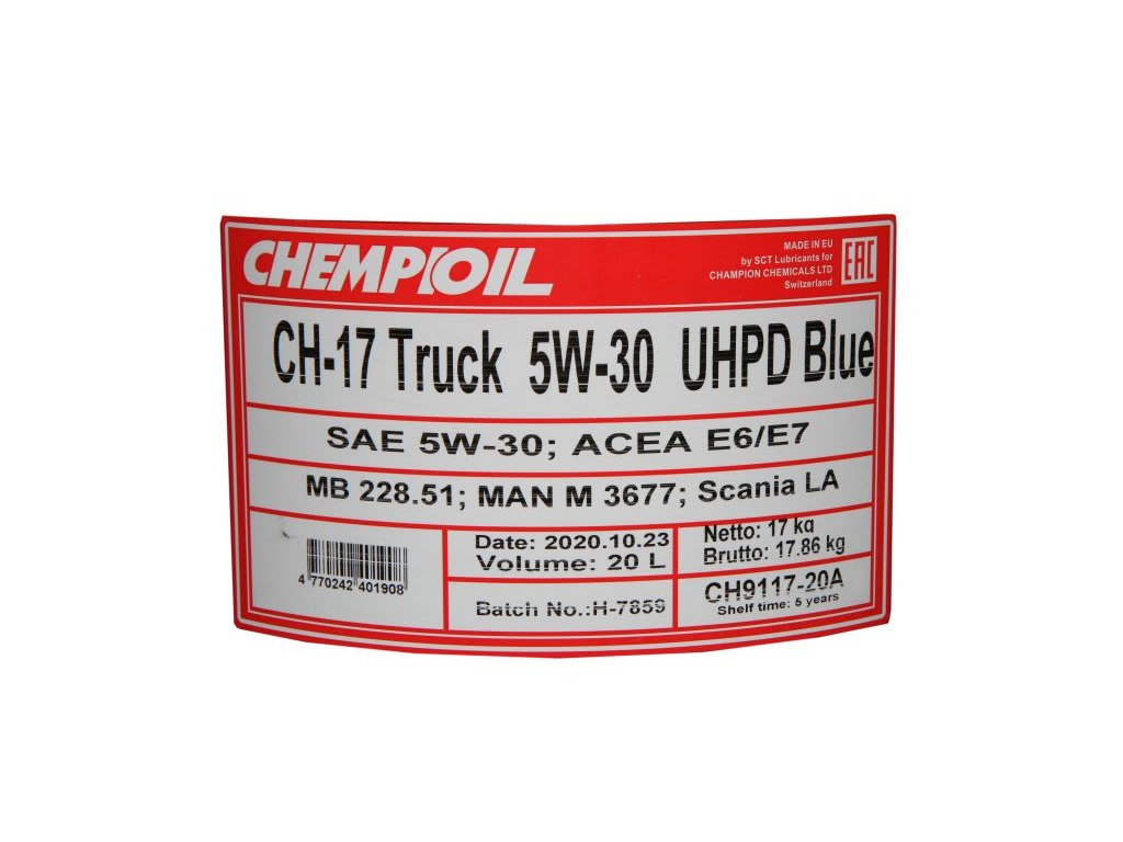 Motorový olej (20 l) 5W30 (s nízkým obsahem mýdla) API CK-4 ACEA E6 E9 CATERPILLAR ECF-3 CUMMINS 20086 DAF ACEA E6 DETROIT DIESEL 93K222 DEUTZ DQC IV-18 LA IVECO MACK EO-S 4.5 MAN 3677 MB 228.51 RENAULDoplňkové parametry