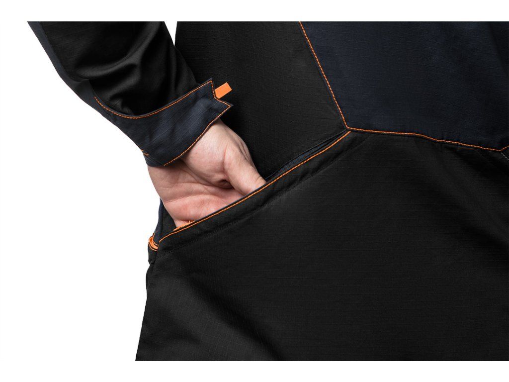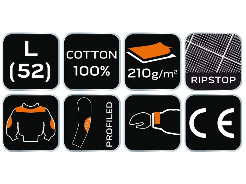 Pracovní mikina Neo Garage, 100% bavlna rip stop, velikost L 81-207-L značky NEO má jedinečný vlastní design a je součástí řady Neo Garage. Díky dlouhému rukávu, vysokému límci a dvojité robustní tkanině je tato mikina ideální pro speciální úkoly. Je vyrobena ze 100% bavlny rip stop 210 g/m2 a výztuh ze 100% polyesteru oxford 220 g/m2. Hlavní zip pod légou se zapíná na patentky a rukávy jsou dvojitě nastavitelné a profilovatelné. Mikina nabízí více možností uložení: 2x ramenní kapsa na tužku/blikačku/vodič, 2x náprsní kapsa s druky, 2x boční prostorná kapsa na zip, 2x bederní kapsa na zip a vyztužená tkaninou oxford. Na ramenou a zádech je dvojitá vrstva látky. Podšívka, logo a prošívání jsou v módní kontrastní barvě - stejně jako logo řady NEO Garage. Mikina má vnitřní jmenovku a je certifikována CE. Jedná se o moderní oděv pro práci i běžné nošení, který vyniká snadným přístupem ke kapsám, výztuhami v místech náchylných k oděru a absencí suchých zipů, které by mechaniky obtěžovaly.Doplňkové parametry