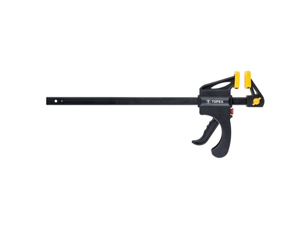 Univerzální automatická svěrka TOPEX s možností použití jako svorky, vzpěry, atd. Užitečná tak při profesionálních pracích, jako i při drobných opravách a stavebních pracích. Plastová rukojeť vyrobena z vysoce kvalitního plastu, profilovaná pro větší komfort používání. Svěrka je kromě toho opatřena systémem umožňujícím rychlé přesouvání čelistí, co práci z nářadím značně usnadňuje. Certifikáty TÜV a GS jsou zárukou spolehlivosti produktu. Značka TOPEX je určena pro domácí kutily.Doplňkové parametry