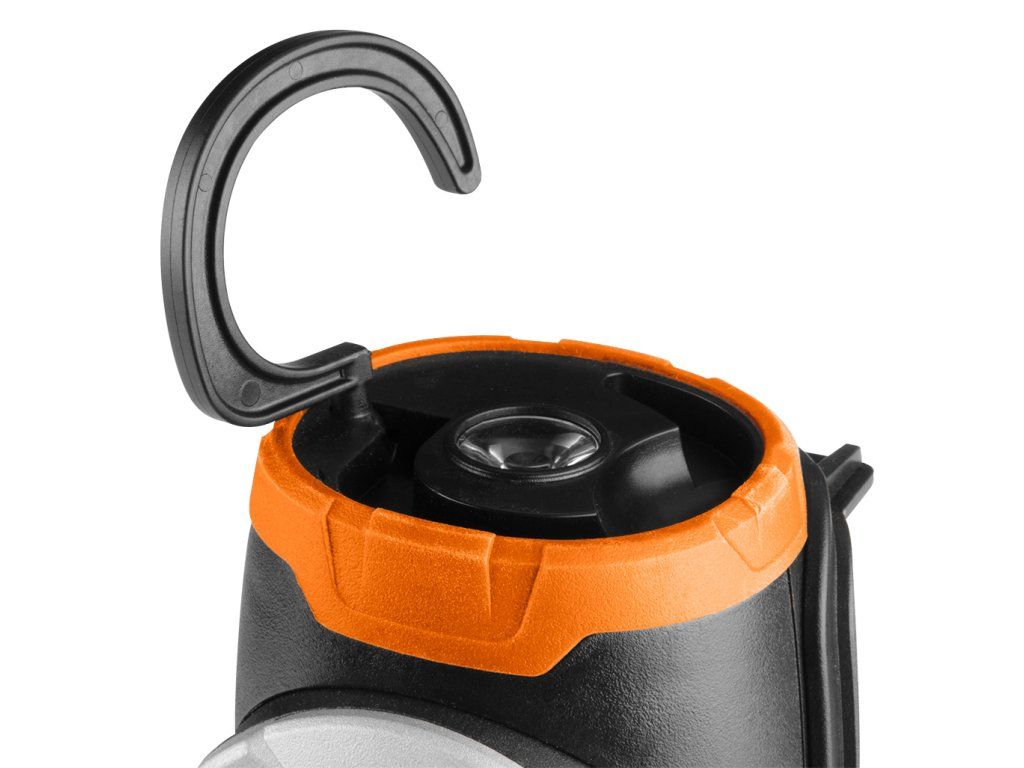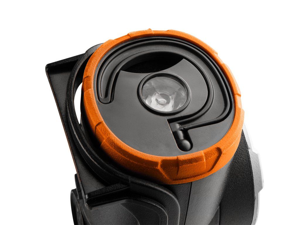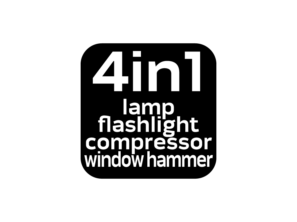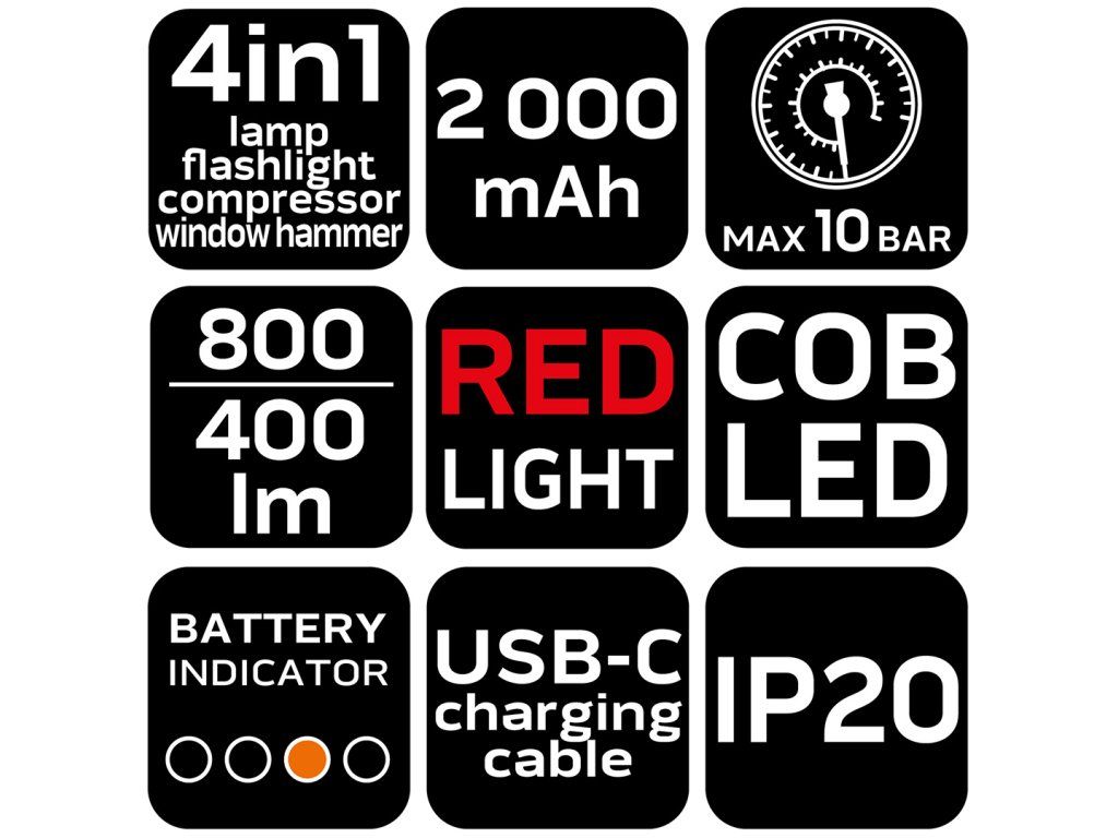 Dobíjecí lampa 800 lm s kompresorem 99-130 od společnosti NEO TOOLS je lampa se svítivostí 800 + 400 lumenů, vybavená LED diodami COB, která je zároveň zařízením 4 v 1. Zahrnuje také funkce svítilny, kompresoru a kladiva na sklo. Má vestavěný akumulátor s kapacitou 2000 mAh a napětím 11,1 V a provozní dobu od 3,5 do 11 hodin v závislosti na použitém režimu: vysoký režim (3,5 - 4 h), nízký režim (7-8 h), červené světlo (9 h), svítilna (11 h). Indikátor nabití baterie informuje uživatele o stavu baterie. Doba potřebná k doplnění úrovně energie se pohybuje mezi 3 d 3,5 h. V balení je nabízen kabel USB C. Kompresor je dimenzován na maximální tlak 10 BAR - funguje i při vybitém akumulátoru přístroje, na napájecí adaptér do auta, který je součástí sady. Je vybaven digitálním displejem pro snadnější ovládání. Přístroj je vybaven ochranou proti přehřátí, pohyblivou hlavou a dotykovým panelem. Stojánek pomáhá stabilizovat lampu. Součástí sady je také hadice na huštění kol, jehla na huštění koulí, adaptér presta/cyklo, dva typy hrotů na huštění a pojistka do auta. Akumulátorová lampa 4 v 1 od společnosti NEO TOOLS s kompresorem, svítilnou a kladivem je jedinečným návrhem víceúčelového zařízení pro každého řidiče, nadšence jednokolky a kutila.Doplňkové parametry