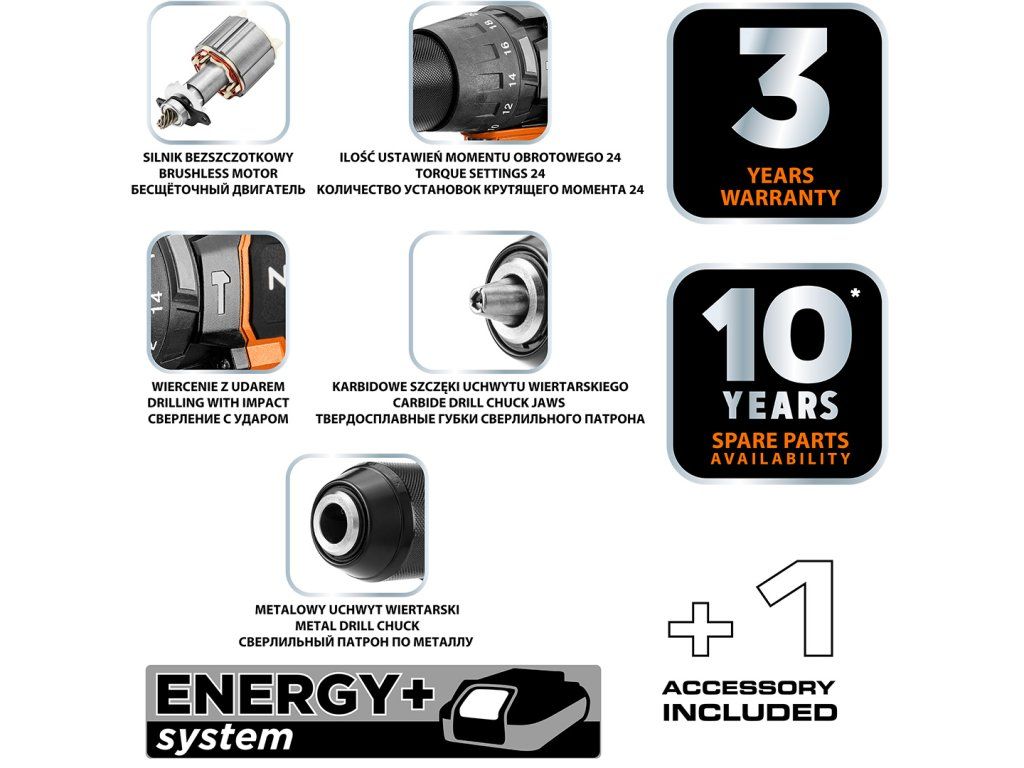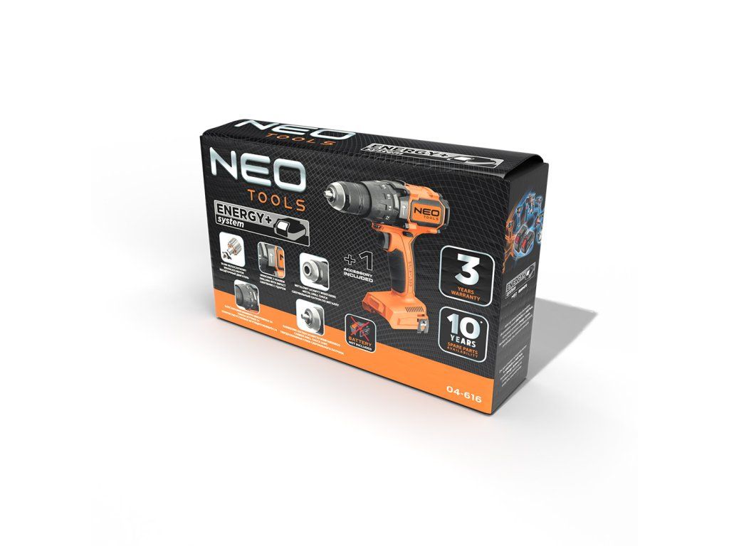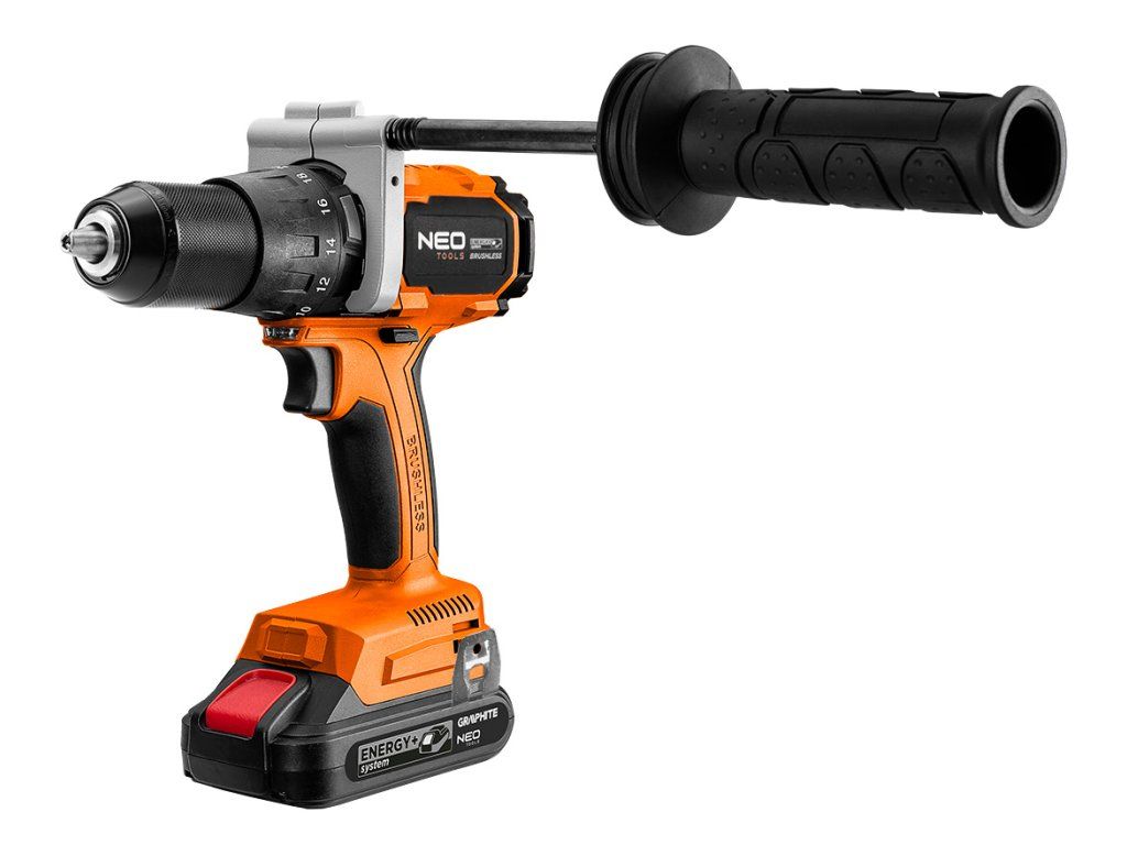 Vrtačka/šroubovák Energy+ 04-616 s příklepem 100 Nm od společnosti NEO je vybavena bezkartáčovým motorem a příklepem. Funguje na bateriovém systému Energy+ a je kompatibilní s lithium-iontovými bateriemi. Doporučená kapacita baterie je 4 Ah. Nástroj má krouticí moment 100 Nm a úderovou frekvenci 7680 na 1. rychlostní stupeň a 30400 na 2. rychlostní stupeň, přičemž maximální počet otáček je 480 za minutu (1. rychlostní stupeň) a 1900 za minutu (2. rychlostní stupeň). Je vybaven robustní kovovou hlavou a 13mm rychloupínacím sklíčidlem. Vrtačka/šroubovák má osvětlení a pohodlnou pogumovanou rukojeť. S nástrojem vám pomůže přídavná rukojeť. Hmotnost zařízení je pouhých 1,53 kg. Jedná se o výrobek značky NEO doporučený pro profesionály i kutily.Doplňkové parametry
