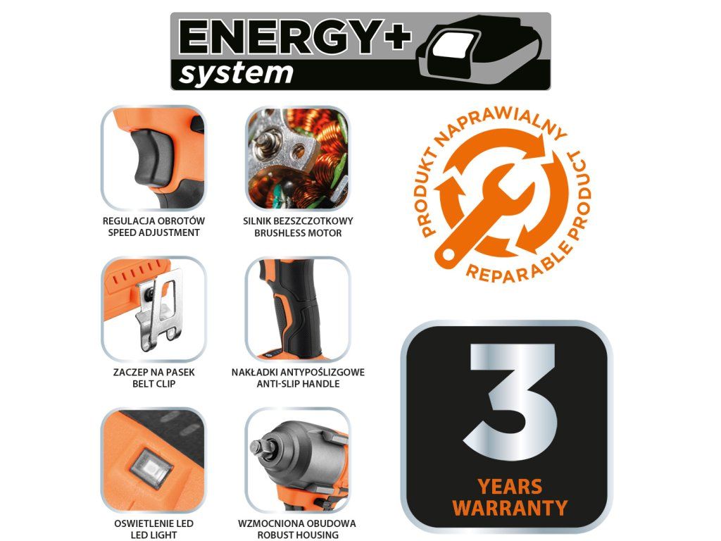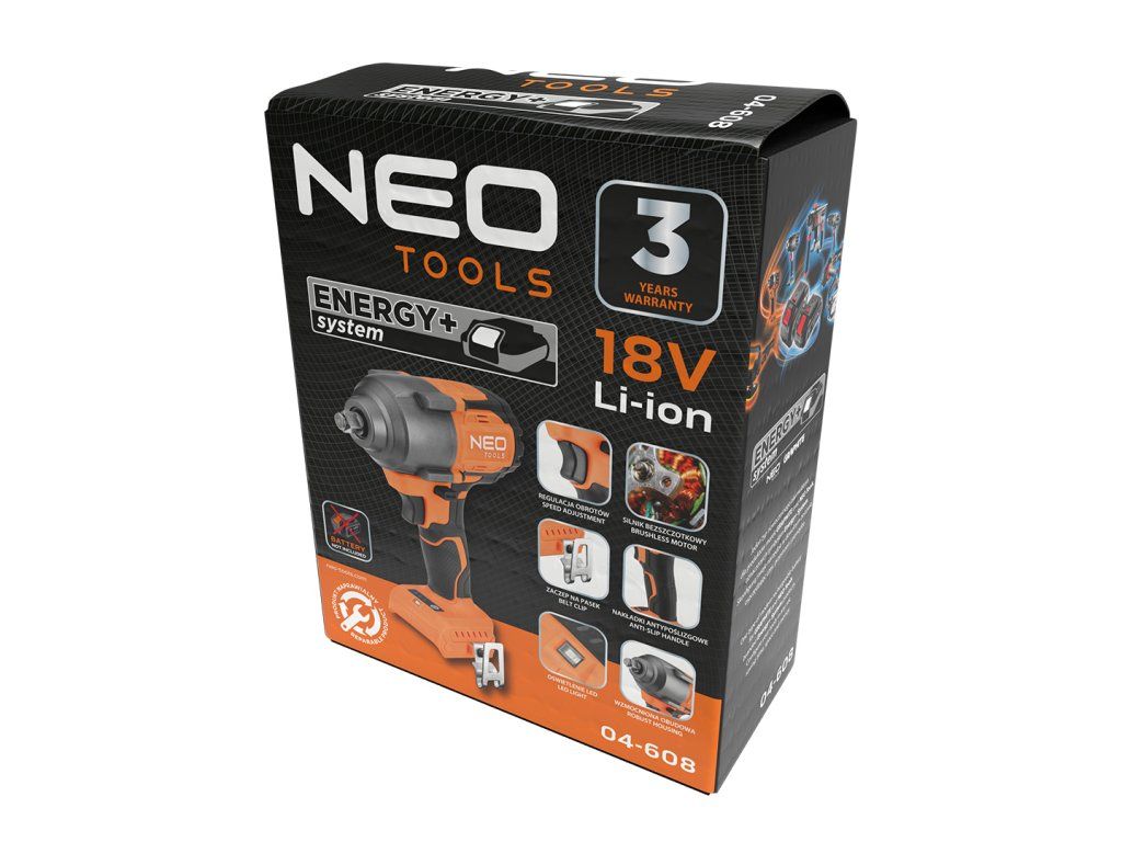 Střídavý rázový klíč E+ 850 Nm 04-608 od společnosti NEO TOOLS je víceúčelové dílenské nářadí se 3 převody a maximálním krouticím momentem 850 Nm. Je vybaven oblíbeným ½" sklíčidlem a je kompatibilní s mnoha druhy příslušenství. Klíč NEO TOOLS funguje na bázi moderního dobíjecího systému Energy+ a 18V lithium-iontových baterií. Jeho pracovní doba závisí na použitém akumulátoru a pohybuje se od 32 minut (2 Ah akumulátor) až po 122 minut (8 Ah akumulátor). Rázový klíč NEO TOOLS je vybaven bezkartáčovým motorem. Vyznačuje se točivým momentem (při převodech I/II/III) 270/360/510 Nm, přičemž maximální točivý moment činí 850 Nm. Frekvence úderů jsou (převody I/II/III) 1500/2000/3000 BPM, zatímco maximální otáčky jsou (převody I/II/III) 1200/1600/2400 min-1. Kromě regulace otáček je elektrické nářadí vybaveno také LED světlem, praktickou sponou na opasek a pogumovanou rukojetí. Kryt převodovky je vyroben ze zesíleného hliníku a hlavní kryt z nylonu vyztuženého skelnými vlákny - jedná se o robustní klíč, který vydrží mnoho měsíců používání.Doplňkové parametry