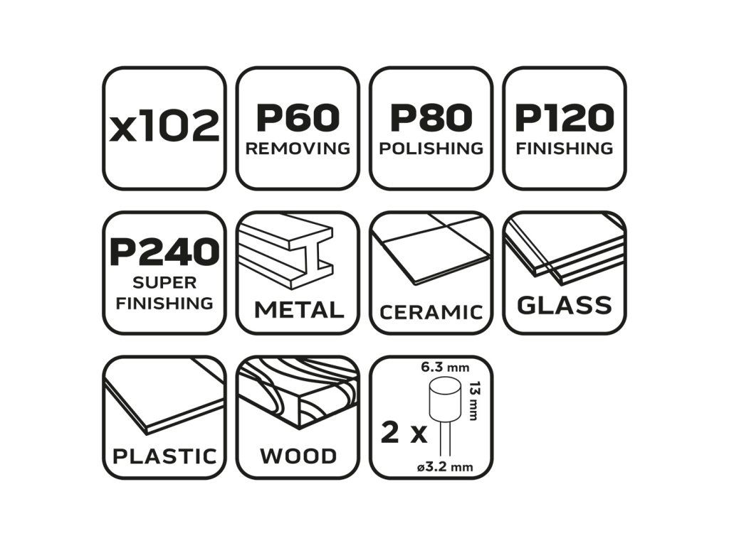 Brusná páska 6,3 mm, P60, P80, P120, P240, sada 100 kusů, + stopka 3,2 mm, 2 kusy 55-076 od NEO TOOLS obsahuje 102 kusů pro přesné obrábění kovů, dřeva, keramiky, skla a plastů. Sada obsahuje pásky o průměru 6,3 mm a pracovní výšce 13 mm v odstupňovaných velikostech: 25 x P60, 25 x P80, 25 x P120 a 25 x P240, vyrobené z oxidu hlinitého, poskytují dobrou řeznou agresivitu a trvanlivé zrno. Sada je doplněna 2 trny NEO TOOLS o průměru 3,2 mm, které jsou vhodné pro použití s typickými rotačními nástroji. Výběr několika zrnitostí v jedné sadě umožňuje hrubé broušení i jemnou povrchovou úpravu. Sada značky NEO TOOLS se osvědčí v dílně, servisu i při precizním kutilství.Doplňkové parametry
