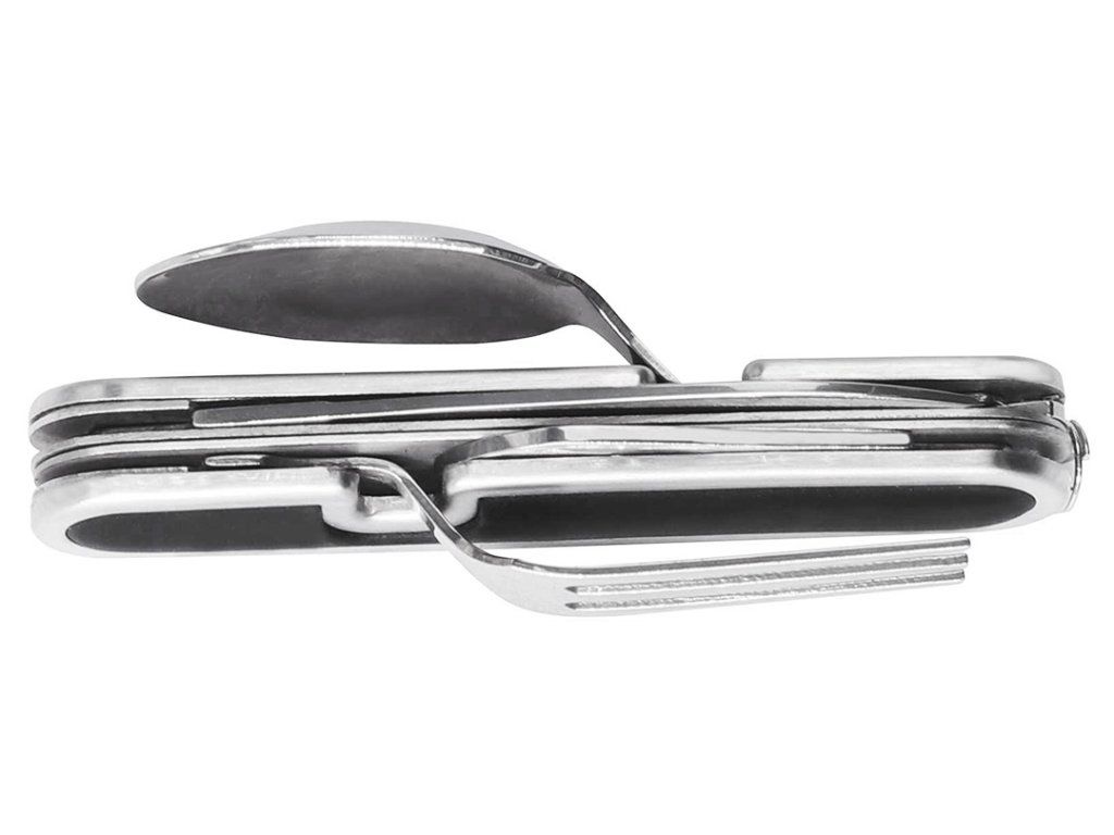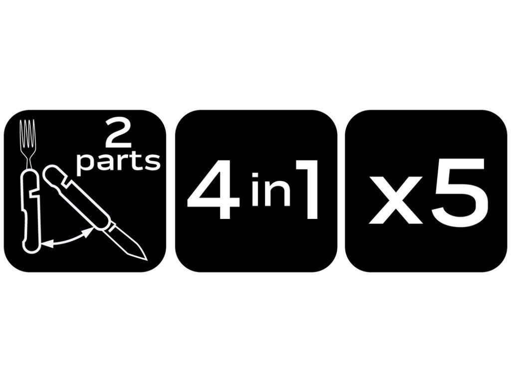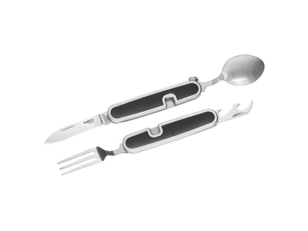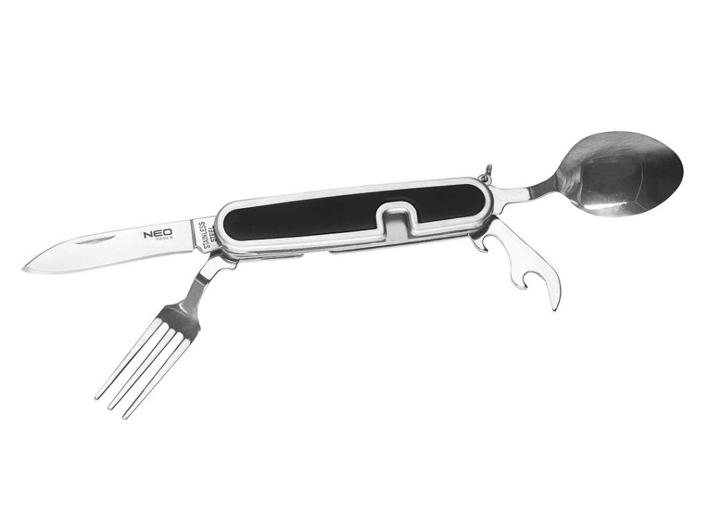 Cestovní potřeby 4 v 1, 63-182-3 od společnosti NEO TOOLS je sada 5 cestovních potřeb, které nabízejí užitečné funkce vidličky, lžíce, čepele nože, otvíráku na konzervy a otvíráku na lahve v jednom výrobku. Příbory jsou vyrobeny z nerezové oceli 3Cr13, zatímco tělo je vyrobeno z kombinace nerezové oceli 410 a TPR. NEO TOOLS essential se vyznačuje délkou před rozložením 88 mm a délkou po rozložení 150 mm. Díky vestavěnému kroužku na zavěšení jej lze snadno připevnit k batohu nebo poutku u kalhot. Esencial 4 v 1 se bude hodit v mnoha outdoorových situacích.Doplňkové parametry