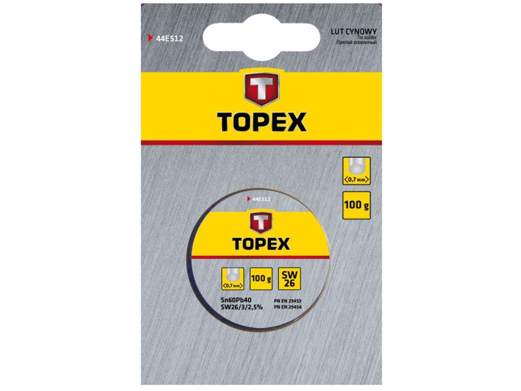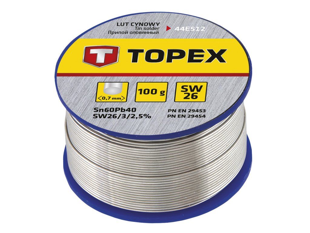 Cínová pájka TOPEX (ref. 44E512) s 60% obsahem cínu, průměr drátu 0,7 mm, hmotnost 100 g, s tavidlem SW26. SW26 je nekorozivní tavidlo pro použití v elektronice a elektrotechnice. Pájecí tavidlo se používá především v elektronickém průmyslu, pro výrobu standardních elektronických zařízení a součástek, v elektrotechnice a pro pájení součástek s povlaky cínu, olova, kadmia, zinku a stříbra.Doplňkové parametry