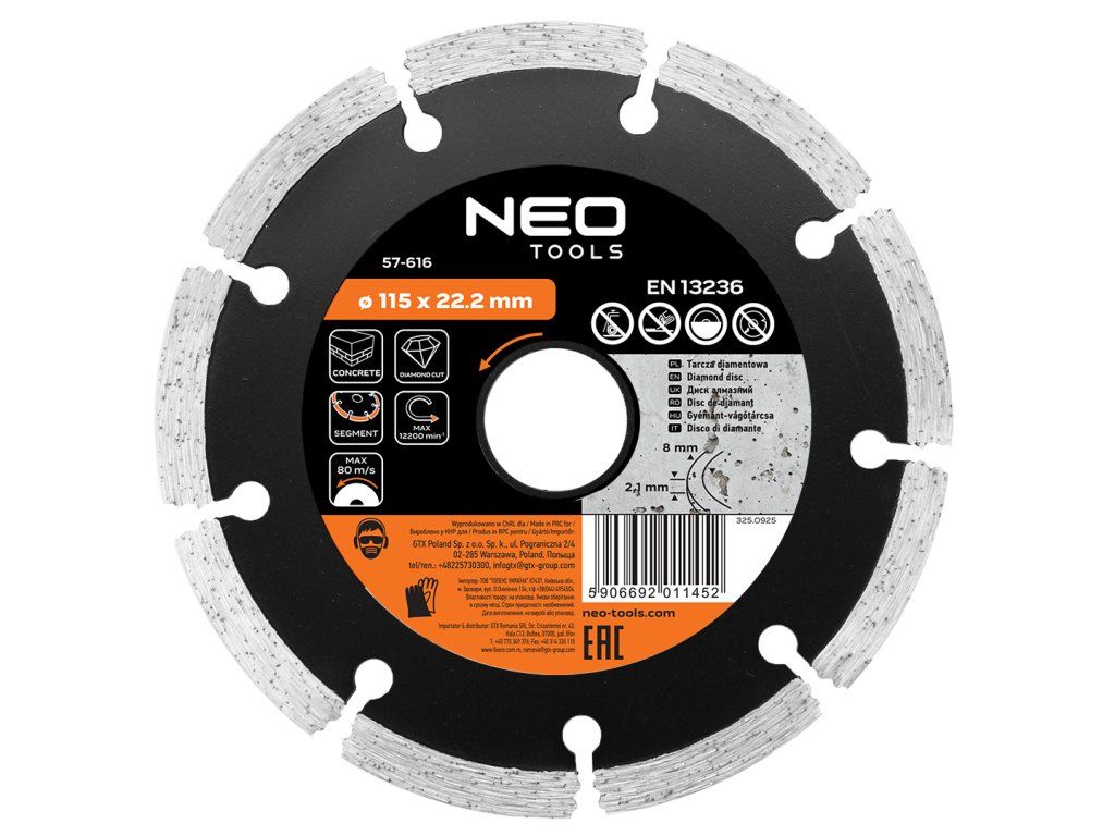 Segmentový diamantový kotouč 57-616 115 x 22,2 mm od společnosti NEO TOOLS s průměrem 115 mm a montážním otvorem 22,2 mm je určen pro suché práce v keramice a betonu. Je vybaven 6 mm vysokými a 1,4 mm silnými segmenty a poskytuje efektivní řezání s dostatečnou stabilitou vedení. Nůž NEO TOOLS splňuje požadavky normy EN 13236 a je navržen pro maximální otáčky 13 200 ot/min a obvodovou rychlost 80 m/s.Doplňkové parametry