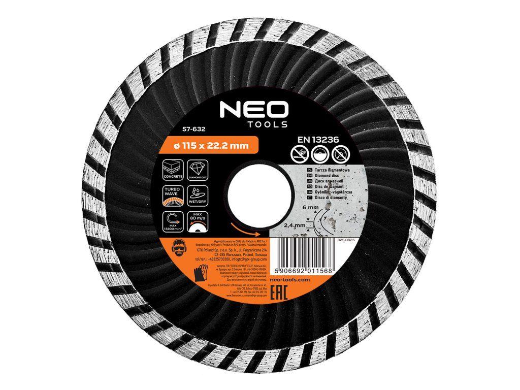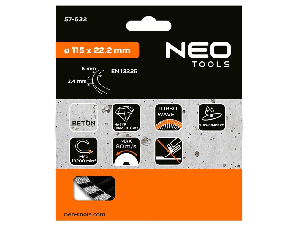 Diamantový kotouč NEO TOOLS 115 x 22,2 mm, turbo wave 57-632 od společnosti NEO TOOLS s průměrem 115 mm a montážním otvorem 22,2 mm je určen k řezání betonu za sucha i za mokra. Je vybaven segmentem o výšce 6 mm a tloušťce 2,4 mm a zajišťuje efektivní opracování povrchu. Kotouč NEO TOOLS splňuje požadavky normy EN 13236 a je navržen tak, aby mohl pracovat při maximálních otáčkách 13 200 ot/min a obvodové rychlosti 80 m/s, takže je bezpečný pro použití s kompatibilními úhlovými bruskami. Diamantový kotouč Turbo wave se vyznačuje vlnitým tělem, které zlepšuje chlazení a odstraňování koroze při řezání. Díky tomu pracuje stabilněji, pomaleji se zahřívá a má delší životnost, zejména při intenzivním řezání betonu.Doplňkové parametry