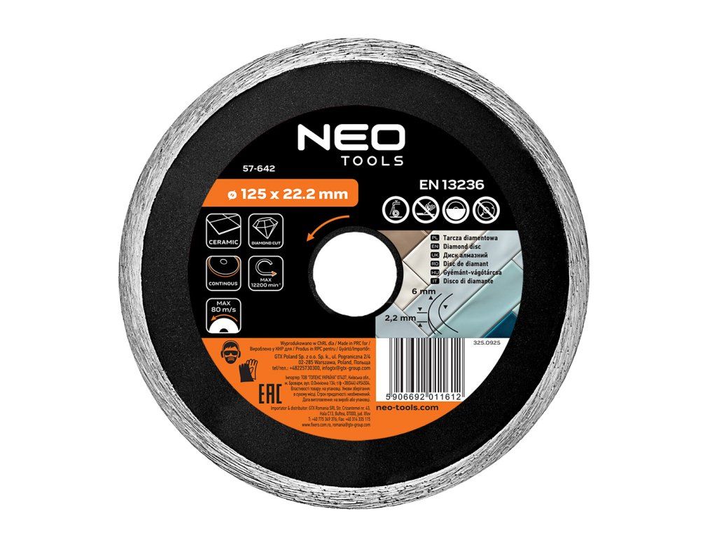 Diamantový kotouč 125 x 22,2 mm, pevný 57-642 od společnosti NEO TOOLS s průměrem kotouče 125 mm a průměrem montážního otvoru 22,2 mm je určen pro ořezávací stroje. Díky svému za tepla lisovanému průběžnému segmentu je ideální pro těžké a náročné stavební práce. Robustní diamantový segment o výšce 6 mm a tloušťce 2,2 mm umožňuje řezat mimo jiné keramické prvky, jako je terakota. Kotouč NEO TOOLS se doporučuje pro řezání za mokra při maximálních otáčkách 12 200 ot/min.Doplňkové parametry