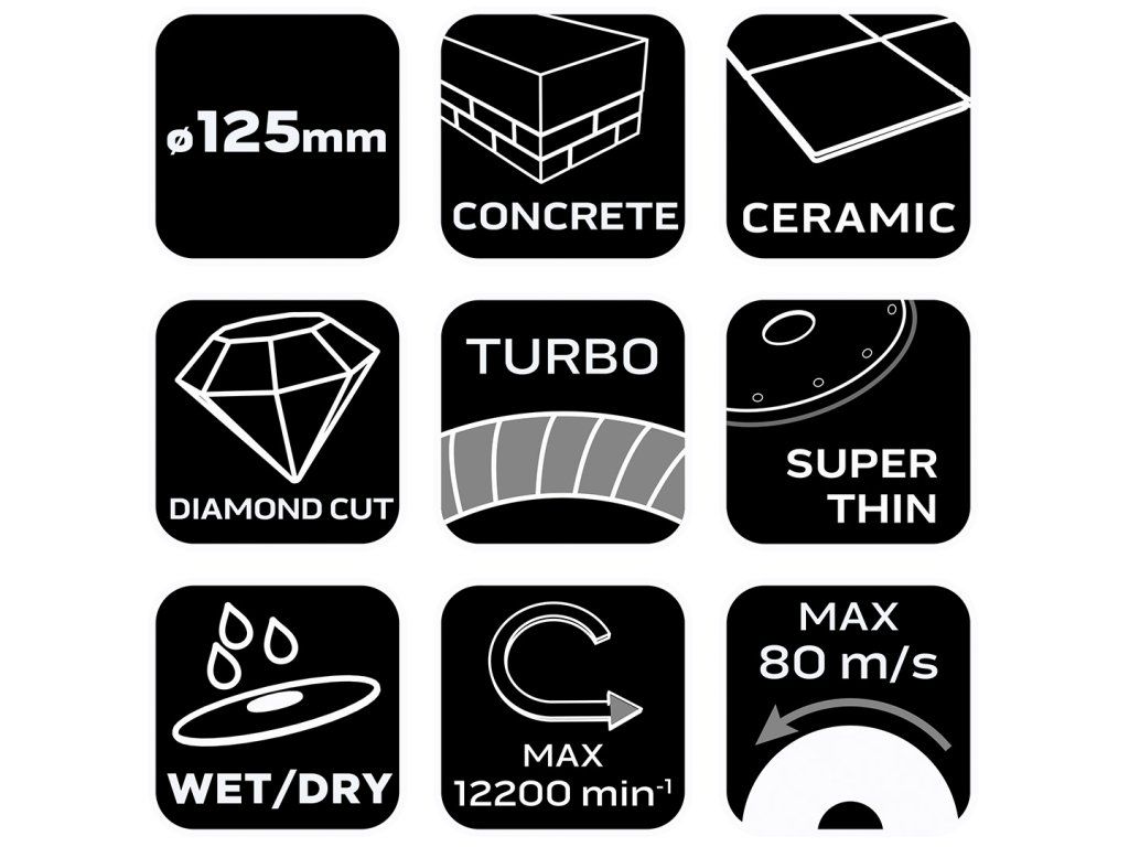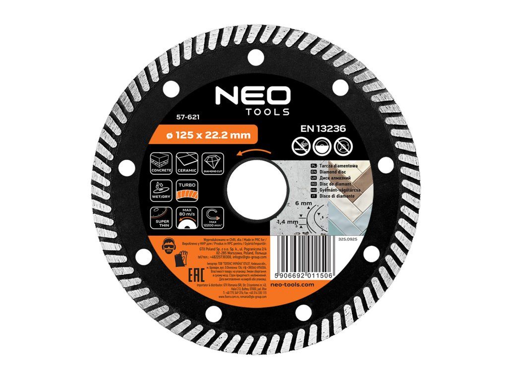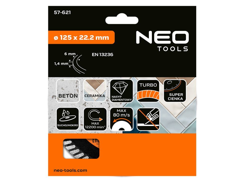 Diamantový kotouč 125 x 22,2 mm, turbo super tenký 57-621 od společnosti NEO TOOLS typ turbo super tenký s průměrem 125 mm a montážním otvorem 22,2 mm je určen k řezání betonu a keramiky za sucha i za mokra. Je vybaven segmentem o výšce 6 mm a tloušťce 1,4 mm a zajišťuje efektivní opracování povrchu. Kotouč NEO TOOLS splňuje normu EN 13236 a je navržen pro práci při maximálních otáčkách 12 200 ot/min a obvodové rychlosti 80 m/s, takže je bezpečný pro použití s kompatibilními úhlovými bruskami. Supertenký diamantový kotouč NEO TOOLS turbo poskytuje extrémně rychlé a přesné řezání díky minimální tloušťce segmentu, která výrazně snižuje odpor při práci v keramice a betonu. Je ideální pro úkoly vyžadující čistou a úzkou řeznou mezeru.Doplňkové parametry