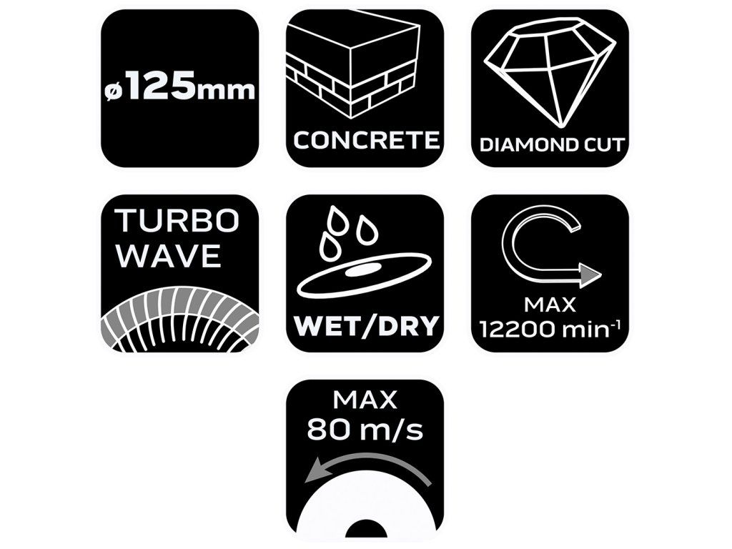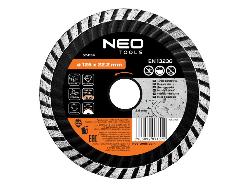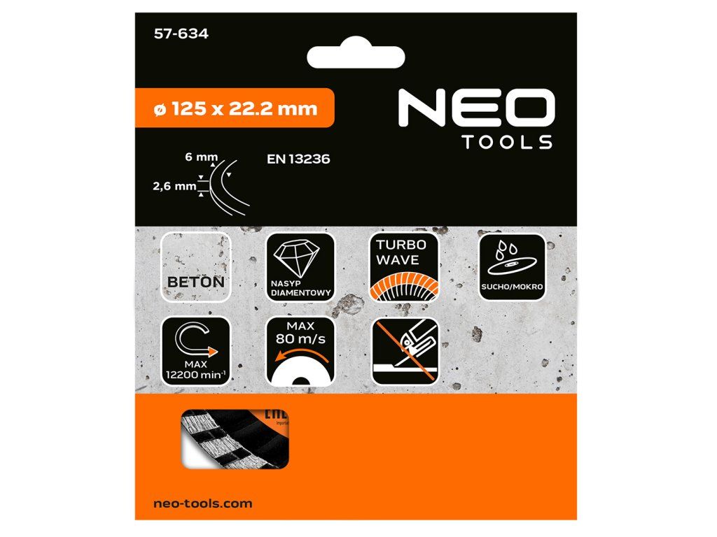 Diamantový kotouč 125 x 22,2 mm, turbo wave 57-634 od společnosti NEO TOOLS typu turbo wave s průměrem 125 mm a montážním otvorem 22,2 mm je určen k řezání betonu za sucha i za mokra. Je vybaven segmentem o výšce 6 mm a tloušťce 2,6 mm a zajišťuje efektivní opracování povrchu. Kotouč NEO TOOLS splňuje požadavky normy EN 13236 a je navržen tak, aby mohl pracovat při maximálních otáčkách 12 200 ot/min a obvodové rychlosti 80 m/s, takže je bezpečný pro použití s kompatibilními úhlovými bruskami. Diamantový kotouč Turbo wave se vyznačuje vlnitým tělem, které zlepšuje chlazení a odstraňování koroze při řezání. Díky tomu pracuje stabilněji, pomaleji se zahřívá a má delší životnost, zejména při intenzivním řezání betonu.Doplňkové parametry
