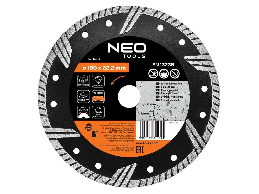 Diamantový kotouč 180 x 22,2 mm, turbo 57-628 od společnosti NEO TOOLS typu turbo s průměrem 180 mm a montážním otvorem 22,2 mm je určen k řezání betonu za sucha i za mokra. Je vybaven segmentem o výšce 6 mm a tloušťce 2,8 mm a zajišťuje efektivní opracování povrchu. Kotouč NEO TOOLS splňuje požadavky normy EN 13236 a je navržen pro práci při maximálních otáčkách 8 500 ot/min a obvodové rychlosti 80 m/s, takže je bezpečný pro použití s kompatibilními úhlovými bruskami.Doplňkové parametry