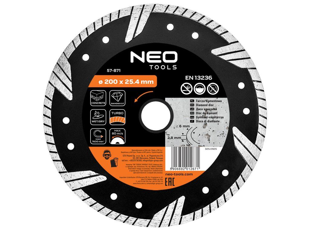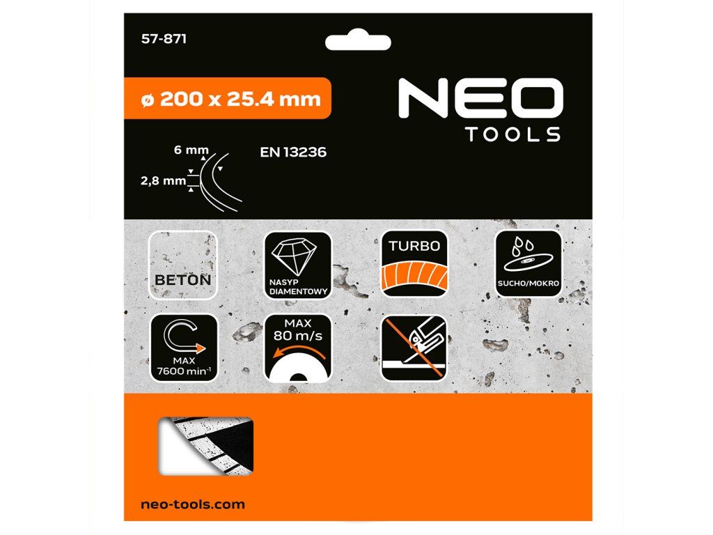 Diamantový kotouč NEO TOOLS 200 x 25,4 mm, typ turbo 57-871 s průměrem 200 mm a montážním otvorem 25,4 mm je určen k řezání betonu za sucha i za mokra. Je vybaven segmentem o výšce 6 mm a tloušťce 2,8 mm a zajišťuje efektivní opracování povrchu. Kotouč NEO TOOLS splňuje požadavky normy EN 13236 a je navržen pro práci při maximálních otáčkách 7 600 ot/min a obvodové rychlosti 80 m/s, takže je bezpečný pro použití s kompatibilními úhlovými bruskami.Doplňkové parametry