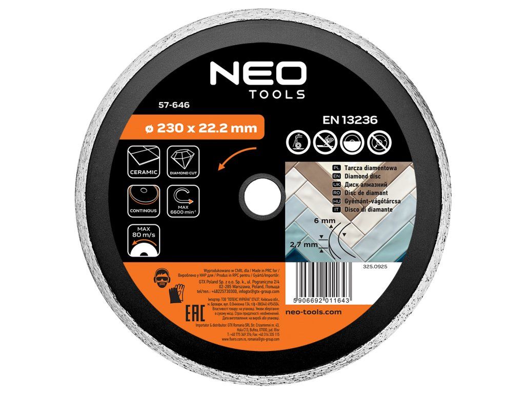 Diamantový kotouč 230 x 22,2 mm, pevný 57-646 od společnosti NEO TOOLS s průměrem kotouče 230 mm a průměrem montážního otvoru 22,2 mm je určen pro ořezávací stroje. Díky svému za tepla lisovanému průběžnému segmentu je ideální pro těžké a náročné stavební práce. Robustní diamantový segment o výšce 6 mm a tloušťce 2,7 mm umožňuje řezat mimo jiné keramické prvky, jako je terakota. Kotouč NEO TOOLS se doporučuje pro řezání za mokra při maximálních otáčkách 6 600 ot/min.Doplňkové parametry