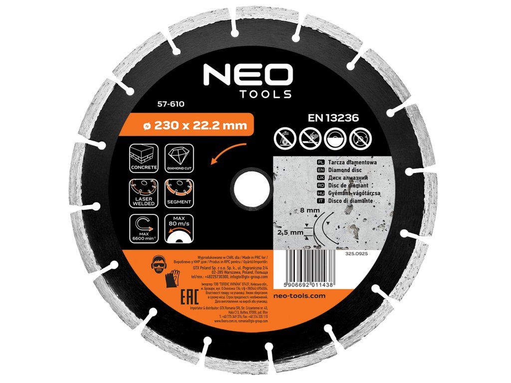 Segmentový, laserem svařovaný diamantový kotouč 57-610 o rozměrech 230 x 22,2 mm od společnosti NEO TOOLS s průměrem 230 mm a montážním otvorem 22,2 mm je určen pro suché práce v betonu, železobetonu, žule, mramoru, cihlách a kameni. Je vybaven laserem svařovanými segmenty o výšce 8 mm a tloušťce 2,5 mm a poskytuje efektivní řezání s dostatečnou stabilitou vedení. Nůž NEO TOOLS splňuje normu EN 13236 a je vhodný pro maximální otáčky 6 600 ot/min a obvodovou rychlost 80 m/s.Doplňkové parametry