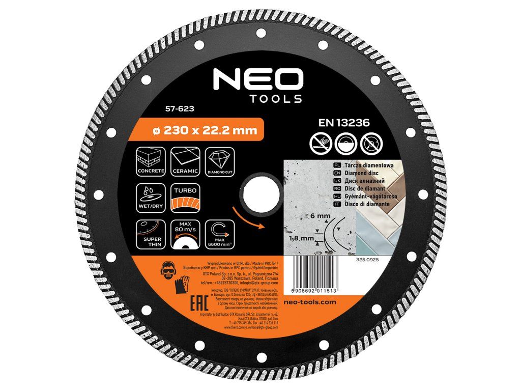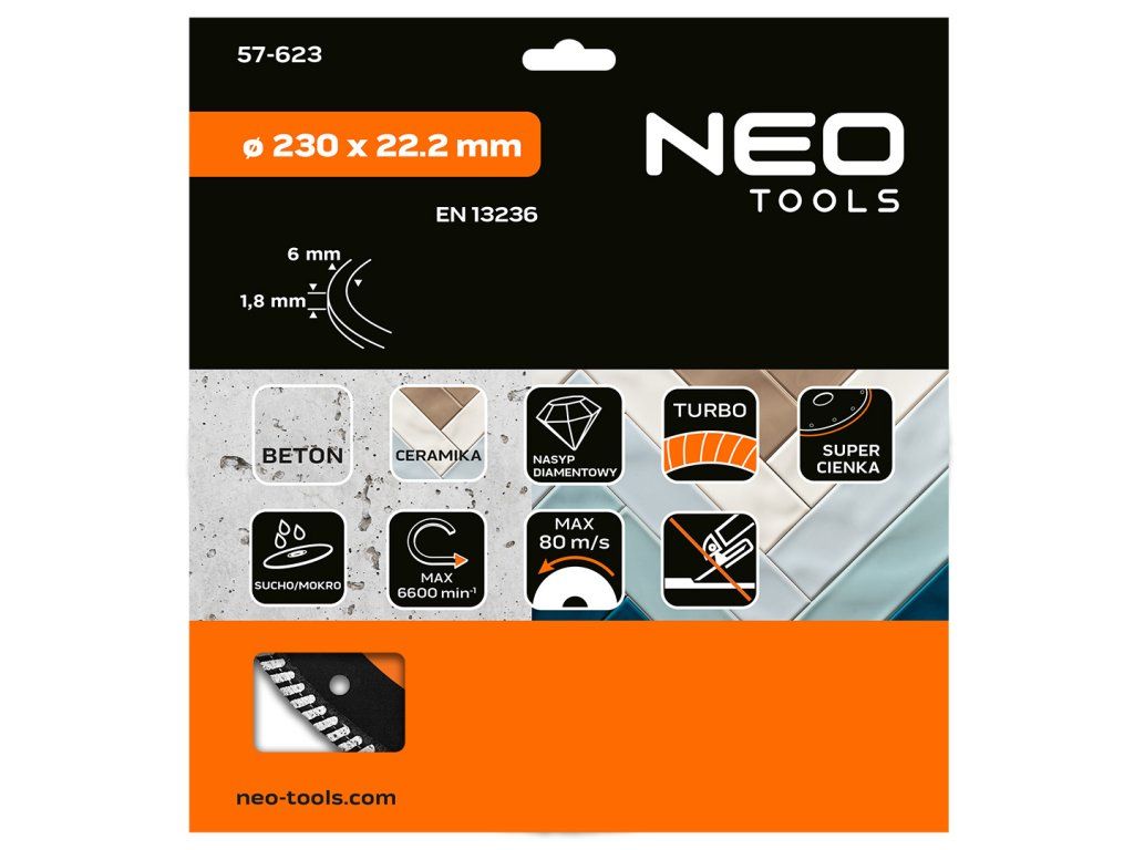 Diamantový kotouč 230 x 22,2 mm, turbo super tenký 57-623 od NEO TOOLS typ turbo super tenký s průměrem 230 mm a montážním otvorem 22,2 mm je určen k řezání betonu a keramiky za sucha i za mokra. Je vybaven segmentem o výšce 6 mm a tloušťce 1,8 mm a zajišťuje efektivní opracování povrchu. Kotouč NEO TOOLS splňuje požadavky normy EN 13236 a je navržen pro práci při maximálních otáčkách 6 600 ot/min a obvodové rychlosti 80 m/s, takže je bezpečný pro použití s kompatibilními úhlovými bruskami. Supertenký diamantový kotouč NEO TOOLS turbo poskytuje extrémně rychlé a přesné řezání díky minimální tloušťce segmentu, která výrazně snižuje odpor při práci v keramice a betonu. Je ideální pro úkoly vyžadující čistou a úzkou řeznou mezeru.Doplňkové parametry