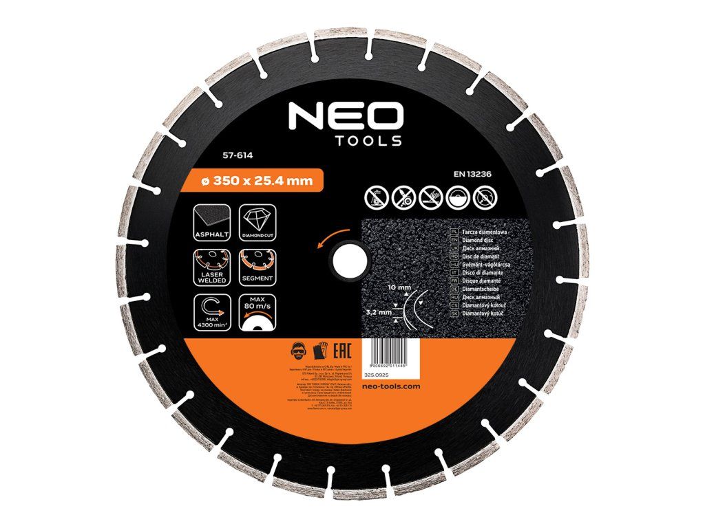 Segmentový, laserem svařovaný diamantový kotouč 57-614 o rozměrech 350 x 25,4 mm od společnosti NEO TOOLS s průměrem 350 mm a montážním otvorem 25,4 mm je určen pro práci za sucha v asfaltu. Je vybaven laserem svařovanými segmenty o výšce 10 mm a tloušťce 3,2 mm a poskytuje efektivní řezání s dostatečnou stabilitou vedení. Nůž NEO TOOLS splňuje požadavky normy EN 13236 a je vhodný pro maximální otáčky 4 300 ot/min a obvodovou rychlost 80 m/s.Doplňkové parametry