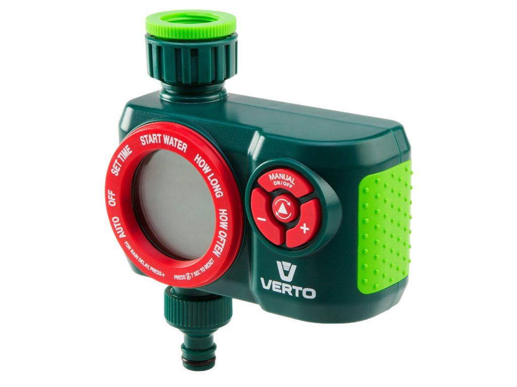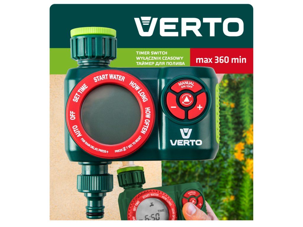 Elektronický časový spínač VERTO (ref. č. 15G751) je vybavený 4 funkčními ovládacími tlačítky. Umožňuje naprogramovat 13 frekvencí zavlažování v rozsahu do 360 minut. Zařízení má indikátor stavu nabití baterie.