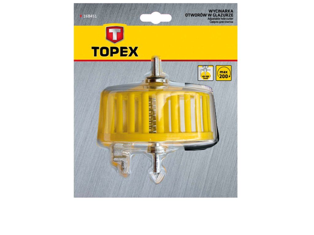 Řezačka otvorů do dlaždic TOPEX (ref. 16B451) řeže otvory o průměru 40-100 mm. Další výhodou je štít chránící před rozstřikováním odřezků dlaždic. Značka TOPEX je určena pro kutily.