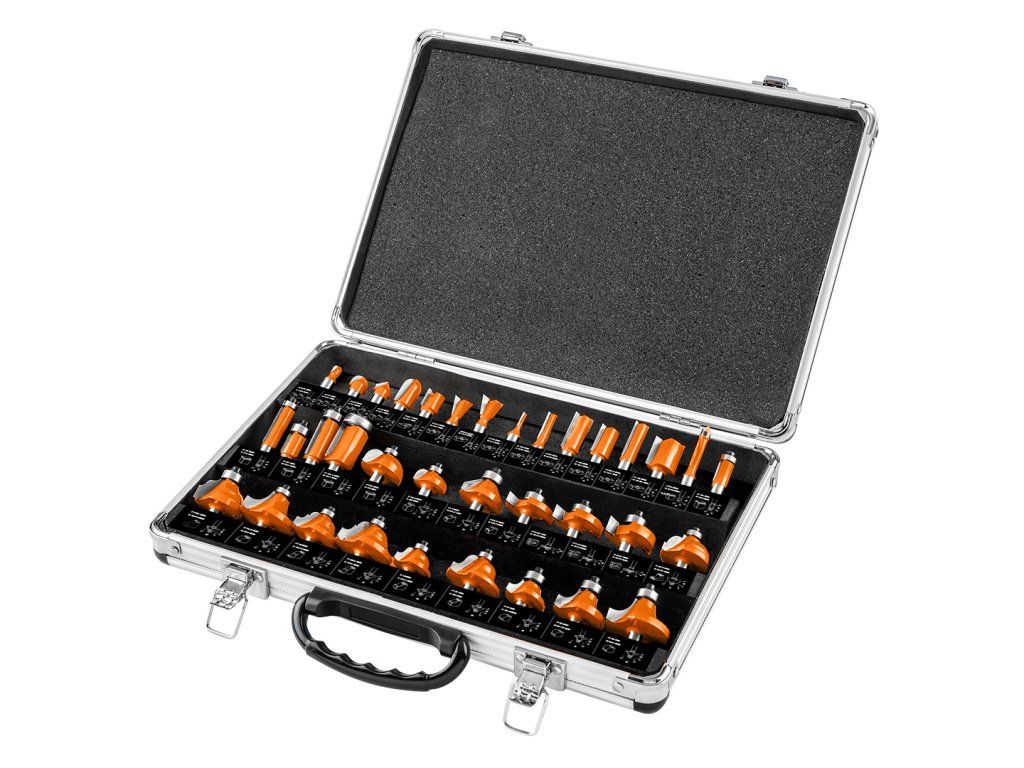 Široké frézy, stopka 8 mm, sada 35 kusů 56-240 od společnosti NEO TOOLS obsahuje 35 kusů fréz uložených v hliníkovém kufříku. Nástroje jsou určeny k opracování dřeva, PVC a dřevotřísky. Sada obsahuje frézy NEO TOOLS různých tvarů: 13 fréz s U-drážkou, 6 rovných fréz, 3 tvarové frézy, 3 drážkovací frézy a 10 ozdobných fréz. Hlavy fréz jsou vybaveny břitovými destičkami z karbidu wolframu (TCT) a ložisky, která usnadňují vedení frézy a zajišťují přesnou a estetickou povrchovou úpravu.Doplňkové parametry