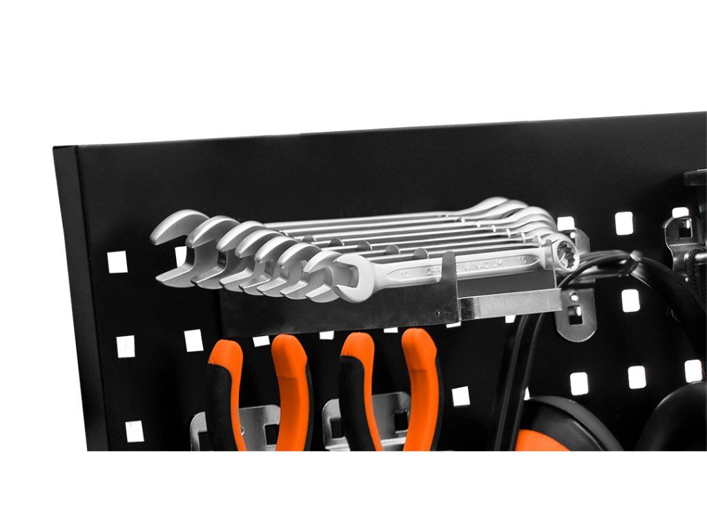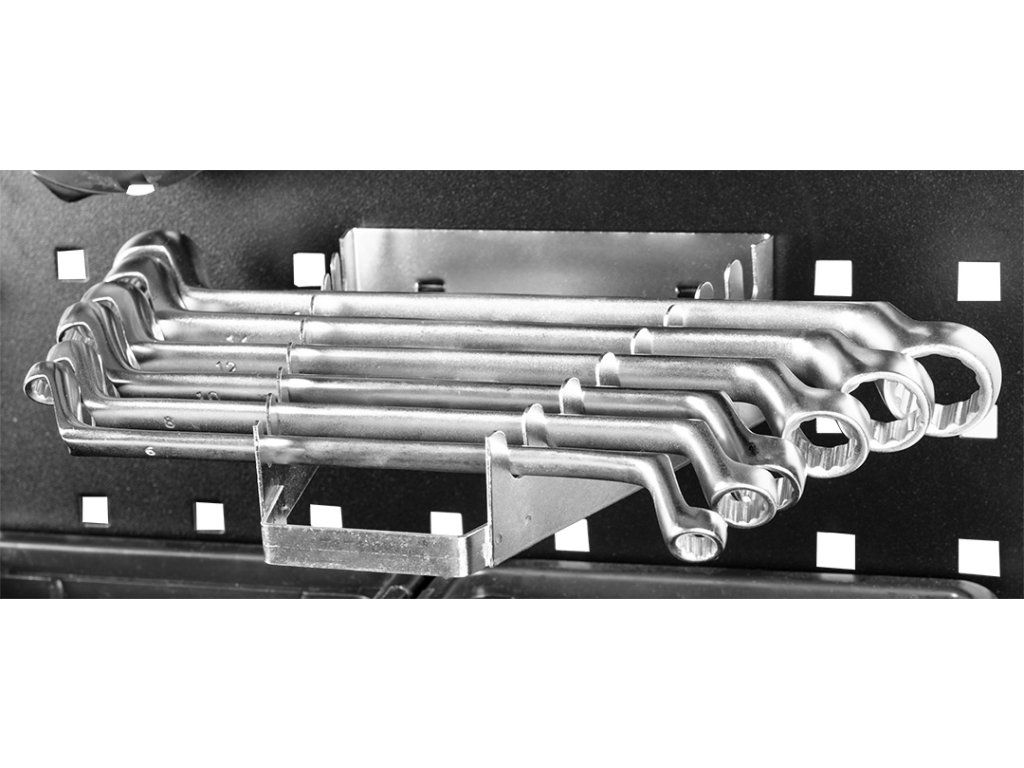 Hák na klíče NEO (ref. č. 84-094) je vyrobený z oceli a je jedním z prvků systému NEO . Hák je určen pro zavěšení plochých, očkoplochých nebo očkových klíčů. Umožňuje skladovat osm kusů klíčů současně. Hák usnadňuje jejich zavěšení, pomáhá udržovat pořádek a poskytuje rychlý přístup ke klíčům. Značka NEO splňuje očekávání profesionálů.Doplňkové parametry