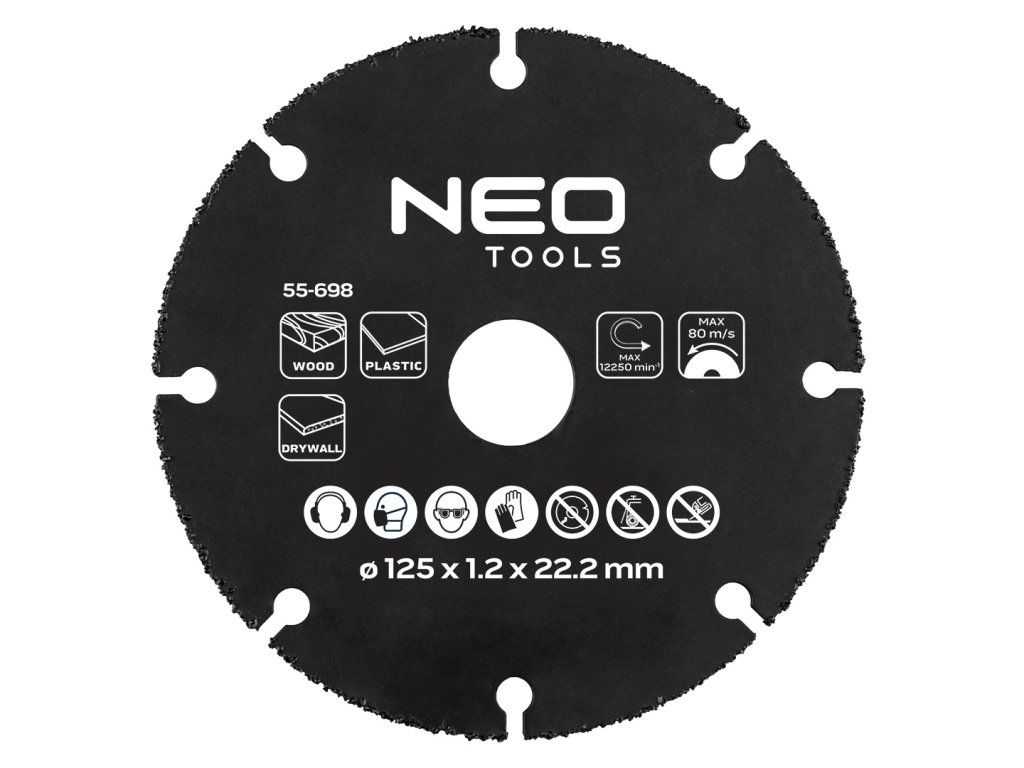 NEO TOOLS HM řezný kotouč na dřevo a plasty 125 x 22,2 mm 55-698 by NEO TOOLS HM řezný kotouč na měkké materiály je určen pro použití s úhlovou bruskou. Má průměr 125 mm, tloušťku 1,2 mm a montážní otvor 22,2 mm. Povlak z karbidu wolframu zajišťuje účinné řezání plastových materiálů, dřeva a sádrokartonu. Kotouč NEO TOOLS je navržen tak, aby pracoval při maximálních otáčkách 12 250 ot/min a obvodové rychlosti až 80 m/s, což umožňuje efektivní a stabilní řezání v typických montážních a dokončovacích aplikacích.Doplňkové parametry