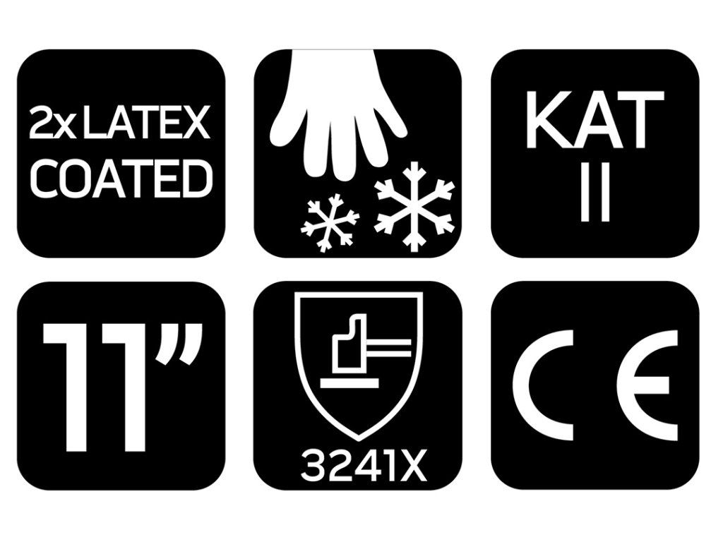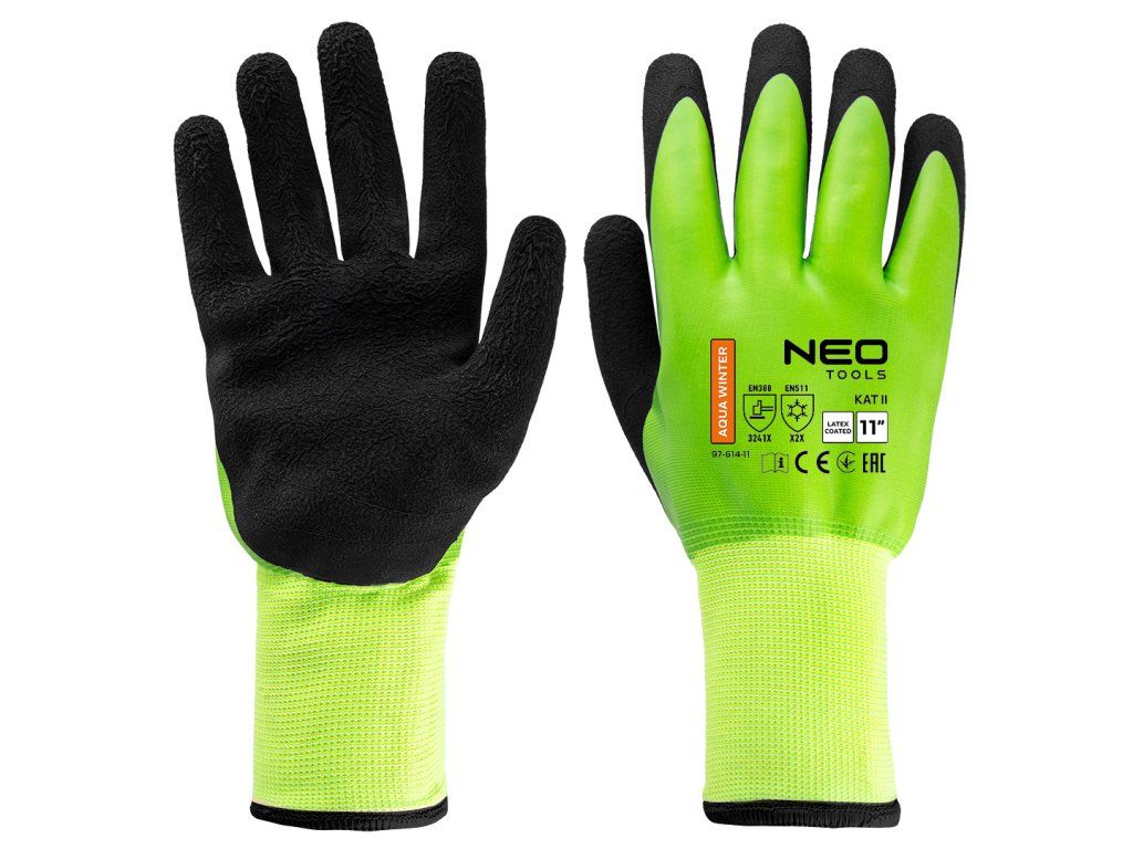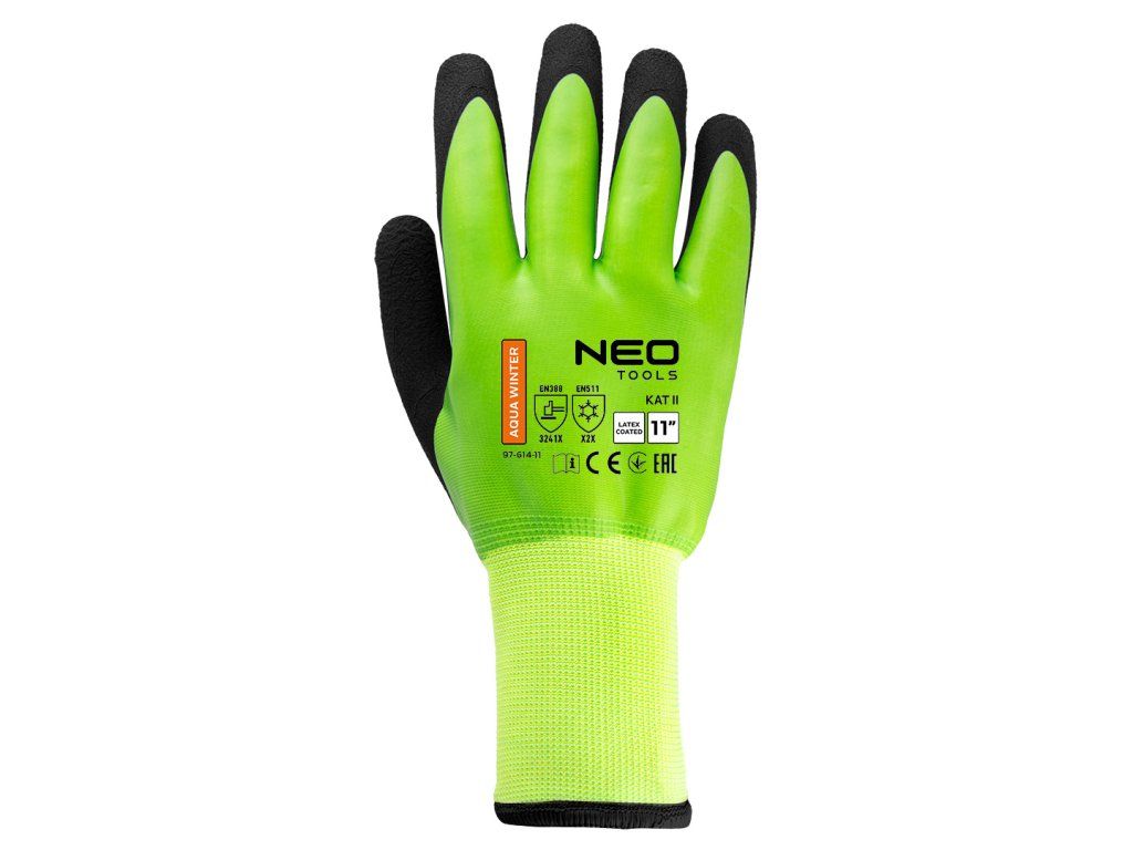 Pracovní rukavice AquaWinter 97-614-11 od společnosti NEO TOOLS jsou voděodolné a zateplené kartáčovaným polyesterem, které jsou vhodné pro zimní práce, odklízení sněhu, přepravu nebo skladování v chladu. Rukavice značky NEO TOOLS mají dvojitý latexový povlak (hladký + pěnový) a patří do kategorie II, 3241X, X2X. Jsou certifikovány podle norem EN388, EN420 a EN511 a vyznačují se odolností proti oděru (3 na stupnici od 0 do 4), odolností proti pořezání ostrými předměty (2 na stupnici od 0 do 5), odolností proti roztržení (4 na stupnici od 0 do 4), odolností proti propíchnutí (1 na stupnici od 0 do 4) a odolností proti proříznutí podle normy EN ISO 13997 X. Pracovní rukavice NEO TOOLS AquaWinter jsou rovněž odolné proti kontaktu s chladem, kontaktu a pronikání vody. Dobře padnou do ruky a díky pěnovému povrchu latexové vrstvy s hrubou strukturou poskytují bezpečný úchop a omezený skluz. Tyto nepromokavé pracovní rukavice NEO TOOLS jsou v zimních měsících nepostradatelným pomocníkem.Doplňkové parametry