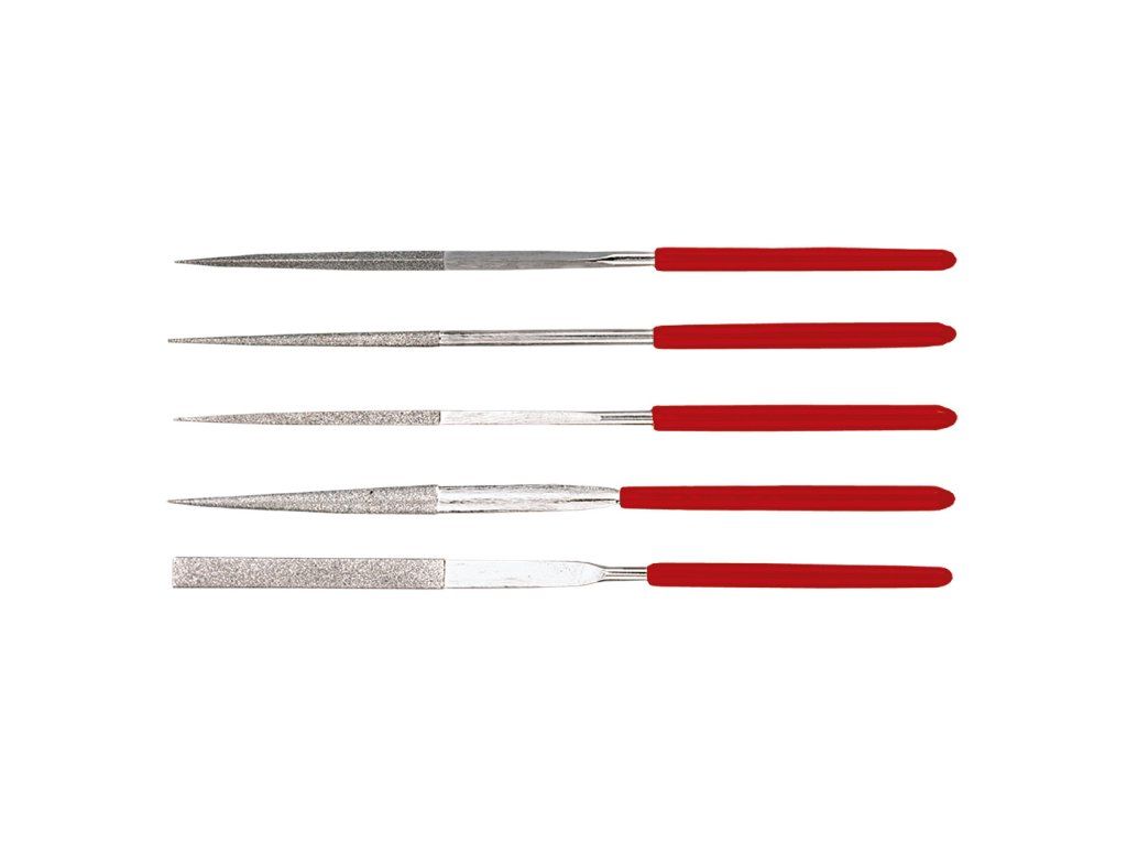 Sada diamantových jehlových pilníků TOPEX (č. 06A000) o délce 140 mm a průměru 4 mm. Určeno k vyhlazování a broušení povrchů, broušení nástrojů. Pět univerzálních tvarů umožňuje různá použití. S pogumovanou rukojetí. Galvanický diamantový povlak. Značka TOPEX je určena pro kutily.Doplňkové parametry