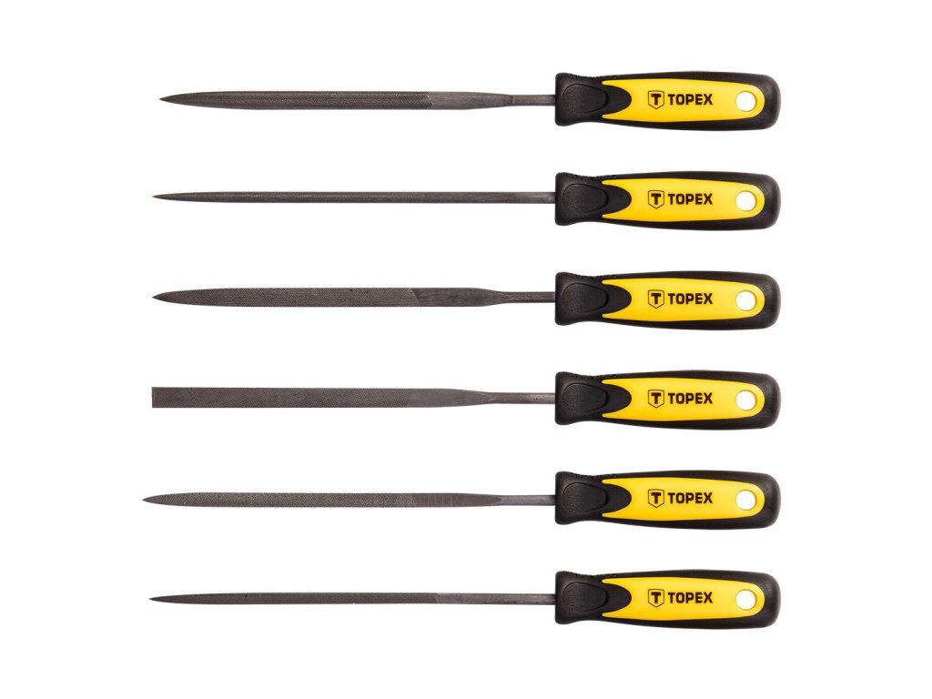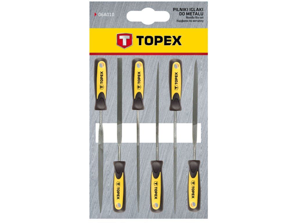 Sada kovových pilníků TOPEX (ref. 06A010) o délce 150 mm a průměru 3 mm. Určeno především pro přesné broušení kovů. Šest univerzálních tvarů umožňuje různá použití. Rukojeť ze dvou materiálů s ergonomickým tvarem velmi dobře padne do ruky, což zajišťuje vysoký komfort práce. Značka TOPEX je určena pro kutily.Doplňkové parametry