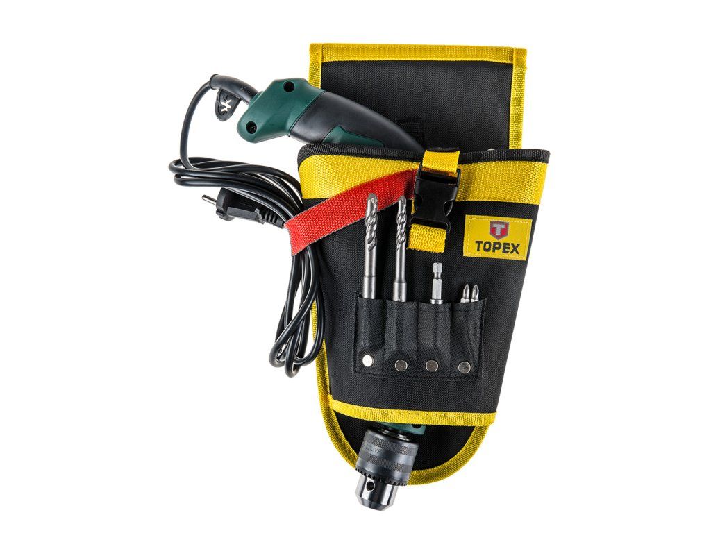 Kabura na elektronarzędzia TOPEX (nr ref. 79R415) wykonana z wytrzymałego tworzywa sztucznego, montowana do pasa. Posiada 4 małe kieszenie na akcesoria typu wiertła lub bity. Umożliwia przenoszenie wiertarki lub wkrętarki, wyposażona jest w pasek z klamrą zabezpieczający narzędzie przed wypadnięciem. Marka TOPEX skierowana jest do majsterkowiczów.Doplňkové parametry