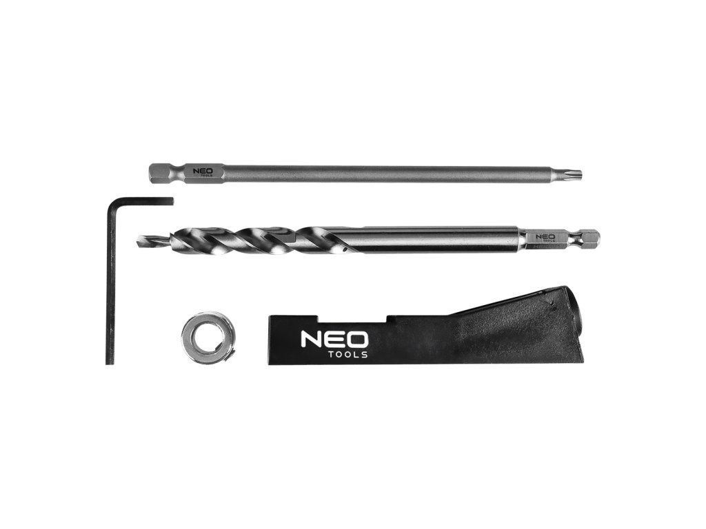 Sada kapesních spojek, 5 položek 55-251 od společnosti NEO TOOLS je komplexní sada nástrojů pro vrtání pod úhlem do různých typů materiálů. Skládá se z: Sada obsahuje: přípravek pro vrtání kapesních otvorů, dvoustupňový vrták o průměru 9,5 mm, vrták T20 torx, imbusový klíč a hloubkový doraz. Doporučuje se pro mnoho aplikací - profesionálních i domácích.Doplňkové parametry