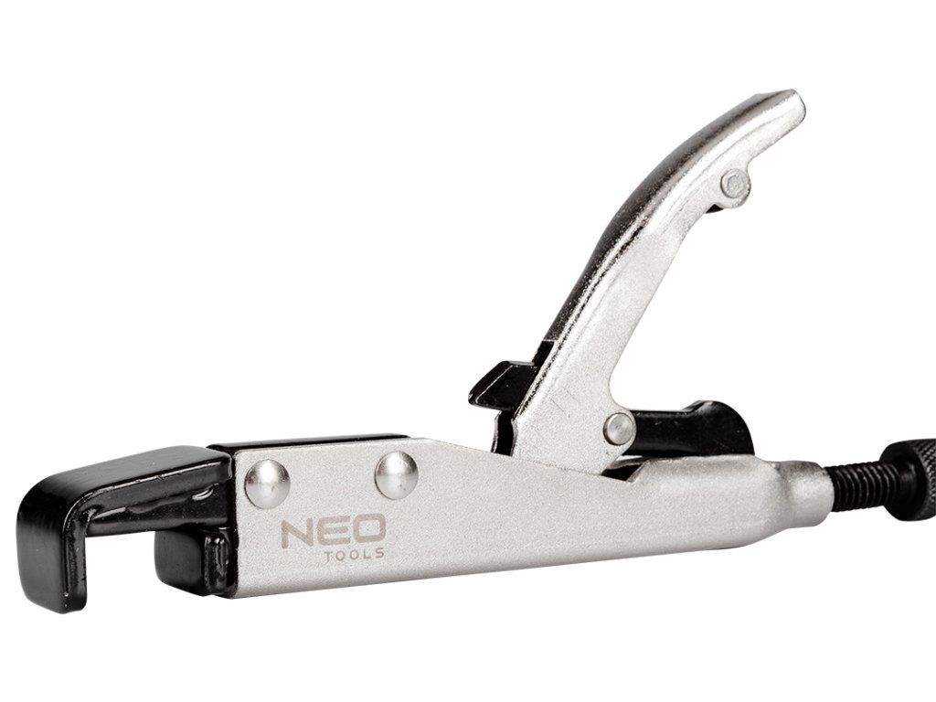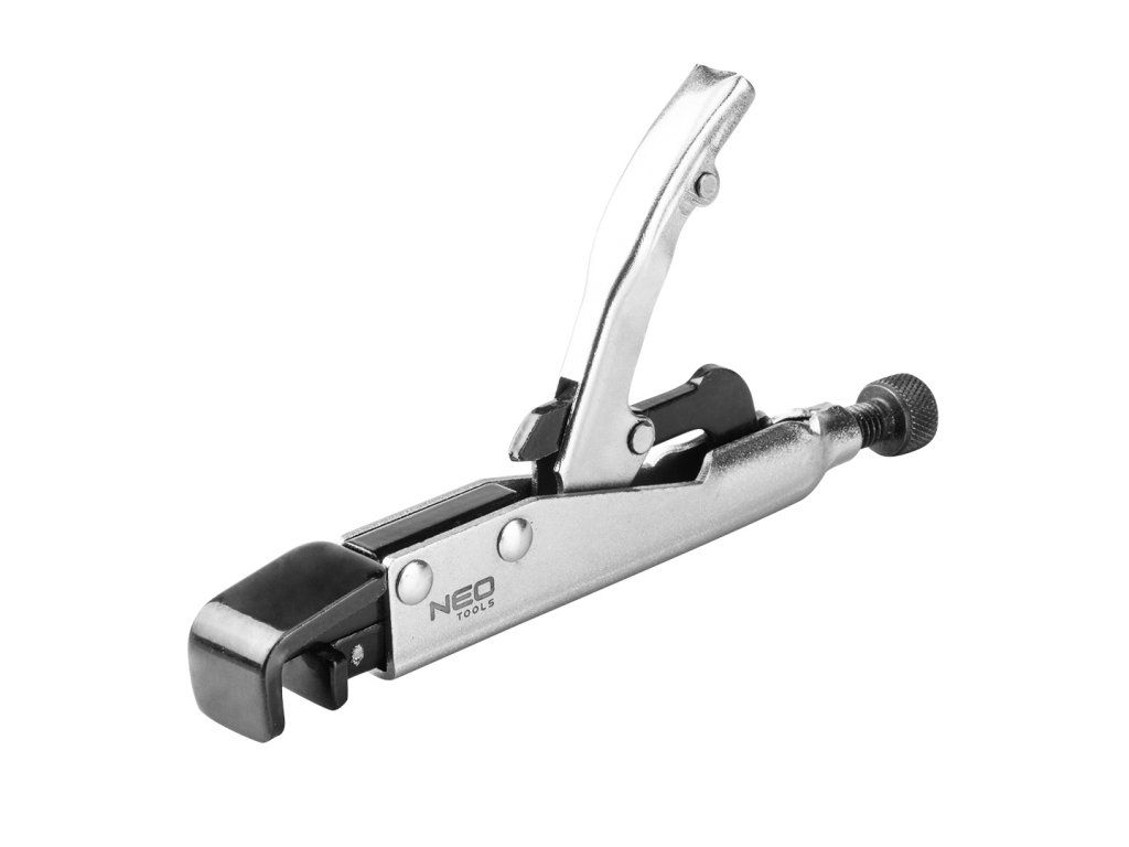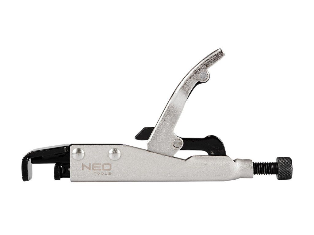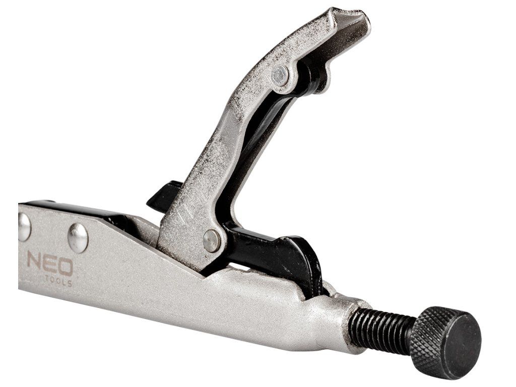 Kleště na plech NEO typ L, dlouhé 195 mm a s maximální roztečí 57 mm, jsou určeny pro práci s plechem, svařování a konstrukci. Kleště jsou vyrobeny z kalené legované oceli. Zesílená konstrukce byla vyrobena z lisovaného plechu. Kleště mají pákový mechanismus s aretací a nastavením stisku, který převádí příčný pohyb rukojeti na podélný pohyb čelistí. Kleště přizpůsobené pro práci v omezeném prostoru, umožňují přesné nasazení spojovaných prvků.Doplňkové parametry