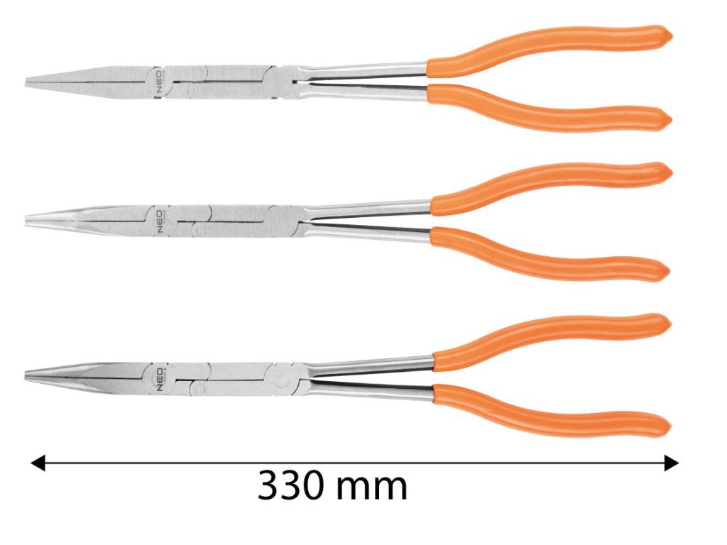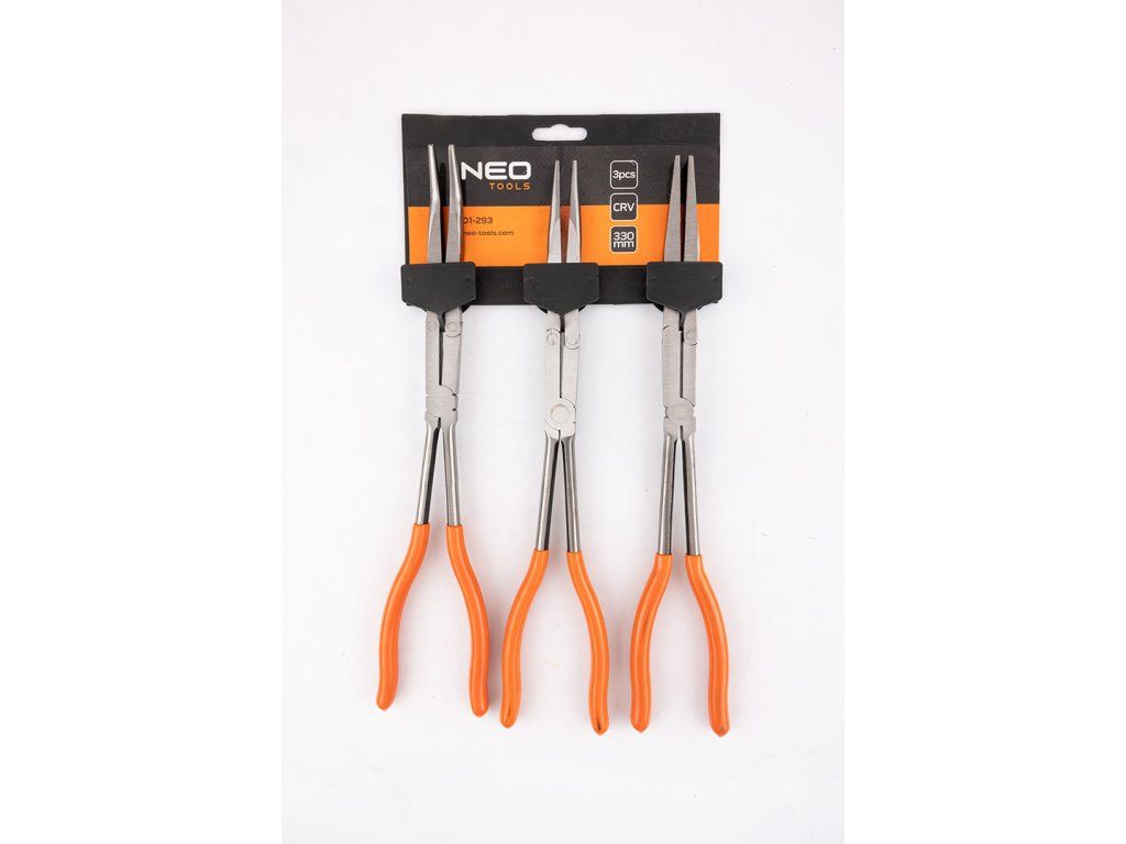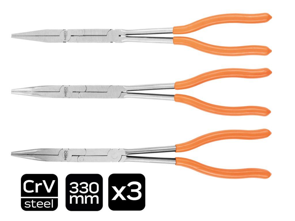 Kleště CRV s dvojitým kloubem, sada 3 kusů 01-293 od NEO TOOLS jsou kleště dlouhé 33 cm. Jsou vyrobeny z oceli CrV a vyznačují se dvojitým kloubem, který jim umožňuje zvládnout velké zatížení a zvyšuje pracovní rozsah. Rukojeti jsou potaženy plastem z PVC. Tvar kleští NEO TOOLS a dvojitý kloub umožňují přístup do těžko přístupných míst. Nářadí se osvědčí v mnoha situacích.Doplňkové parametry