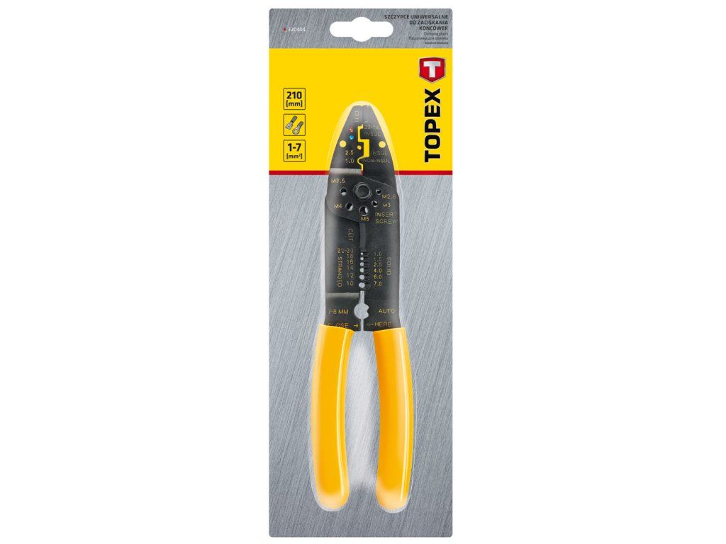 Kleště na koncové krimpování TOPEX (ref. 32D404) 210 mm dlouhé a s pracovním rozsahem od 1 do 7 mm2. Určeno pro lisování různých koncovek kabelů. Rukojeť pokrytá protiskluzovým materiálem poskytuje pohodlí při práci. Značka TOPEX je určena pro kutily.Doplňkové parametry