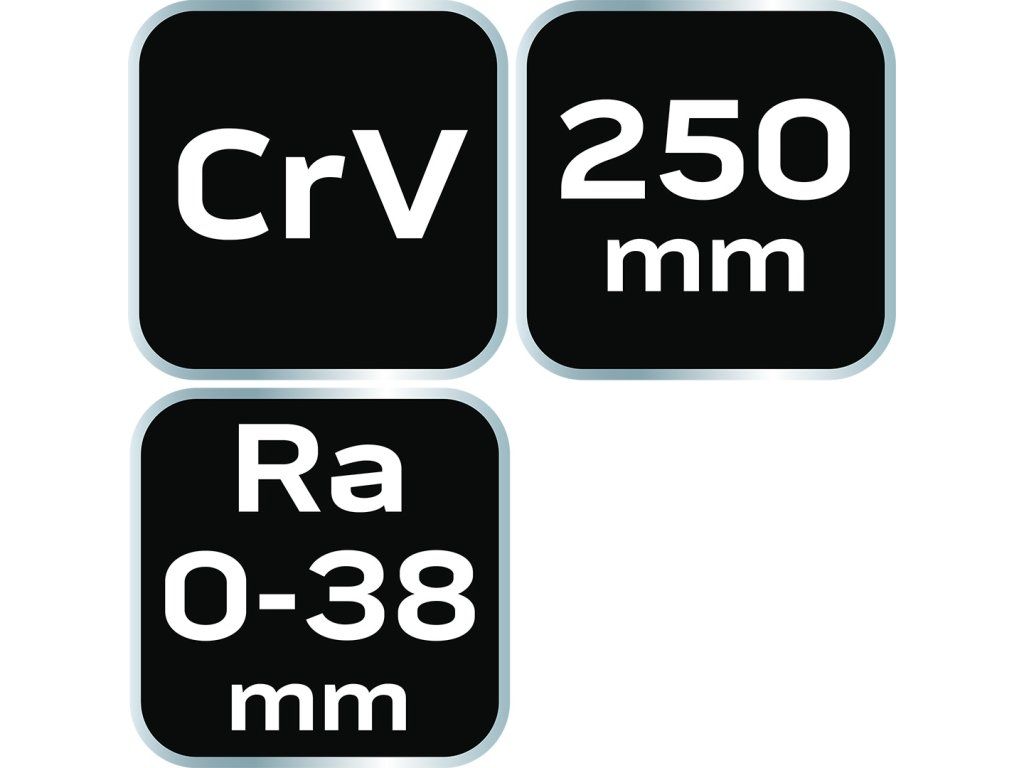 Kleště na trubky NEO (ref. 02-412) s délkou 250 mm a maximálním rozevřením čelistí 38 mm. Vyrobeno z odolné chrom-vanadiové oceli, která zajišťuje dlouhou životnost nástroje. Ergonomické rukojeti pokryté protiskluzovým materiálem zajišťují pohodlí a bezpečnost při práci. Výrobek dobře padne do ruky. Značka NEO splňuje očekávání profesionálů.Doplňkové parametry