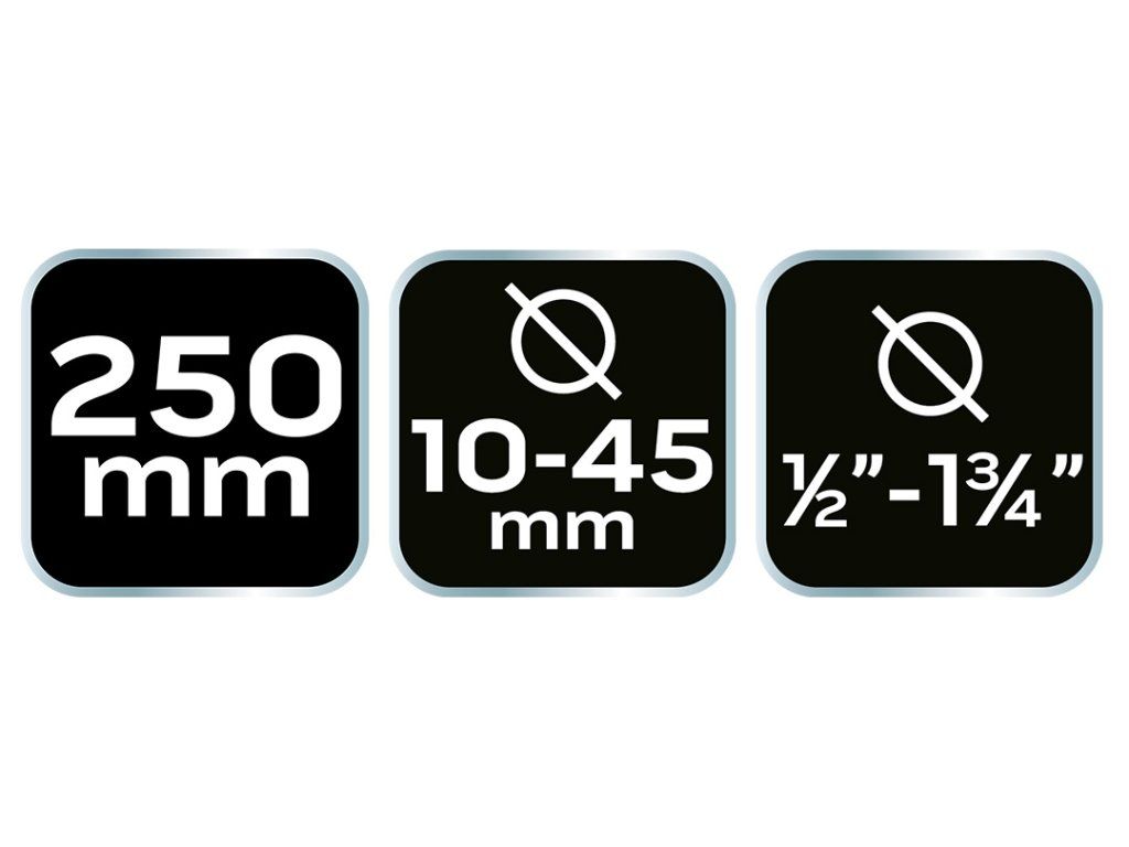Kleště na trubky NEO (ref. 02-401) 250 mm dlouhé. Minimální otvor je 10 mm a maximální 45 mm. Ergonomické rukojeti pokryté protiskluzovým materiálem zajišťují pohodlí a bezpečnost při práci. Výrobek správně padne na ruku. Značka NEO splňuje očekávání profesionálů.Doplňkové parametry