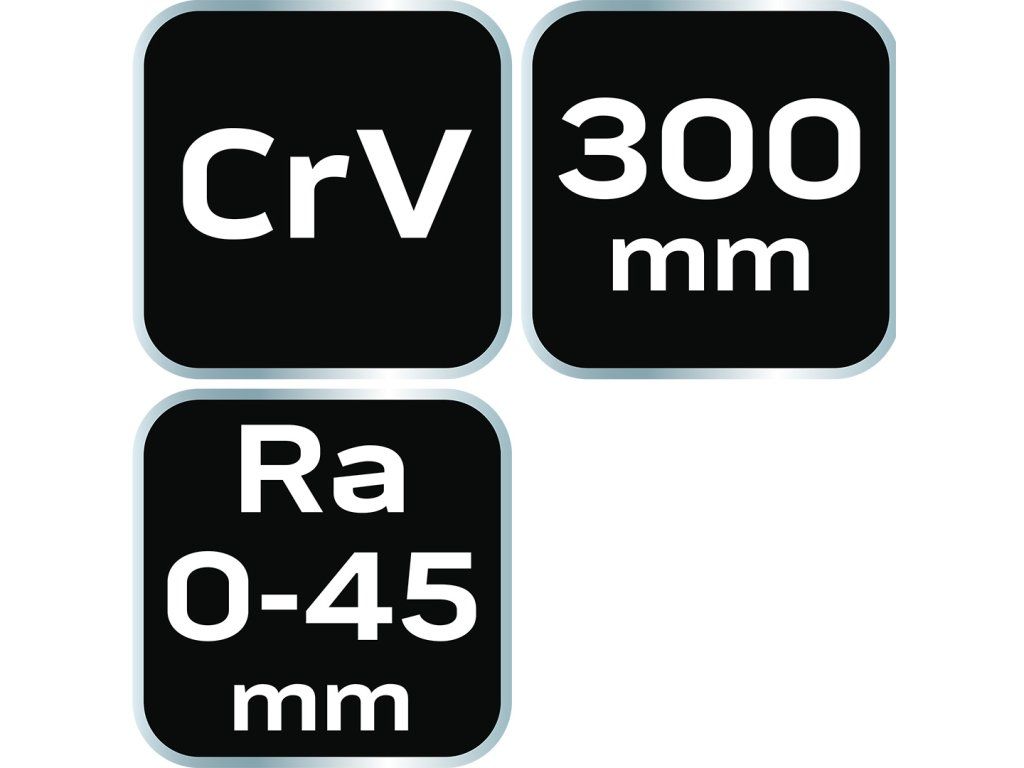 Kleště na trubky NEO (ref. 02-413) o délce 300 mm a maximálním rozevření čelistí 45 mm. Vyrobeno z odolné chrom-vanadiové oceli, která zajišťuje dlouhou životnost nástroje. Ergonomické rukojeti pokryté protiskluzovým materiálem zajišťují pohodlí a bezpečnost při práci. Výrobek dobře padne do ruky. Značka NEO splňuje očekávání profesionálů.Doplňkové parametry