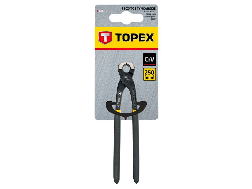 Kleště na omítku TOPEX (ref. 32D541) 250 mm dlouhé. Vyrobeno z vysoce kvalitní chrom-vanadiové oceli, která zajišťuje dlouhou životnost nástroje. Ergonomické rukojeti pokryté protiskluzovým materiálem zajišťují pohodlí a bezpečnost při práci. Značka TOPEX je určena pro kutily.Doplňkové parametry