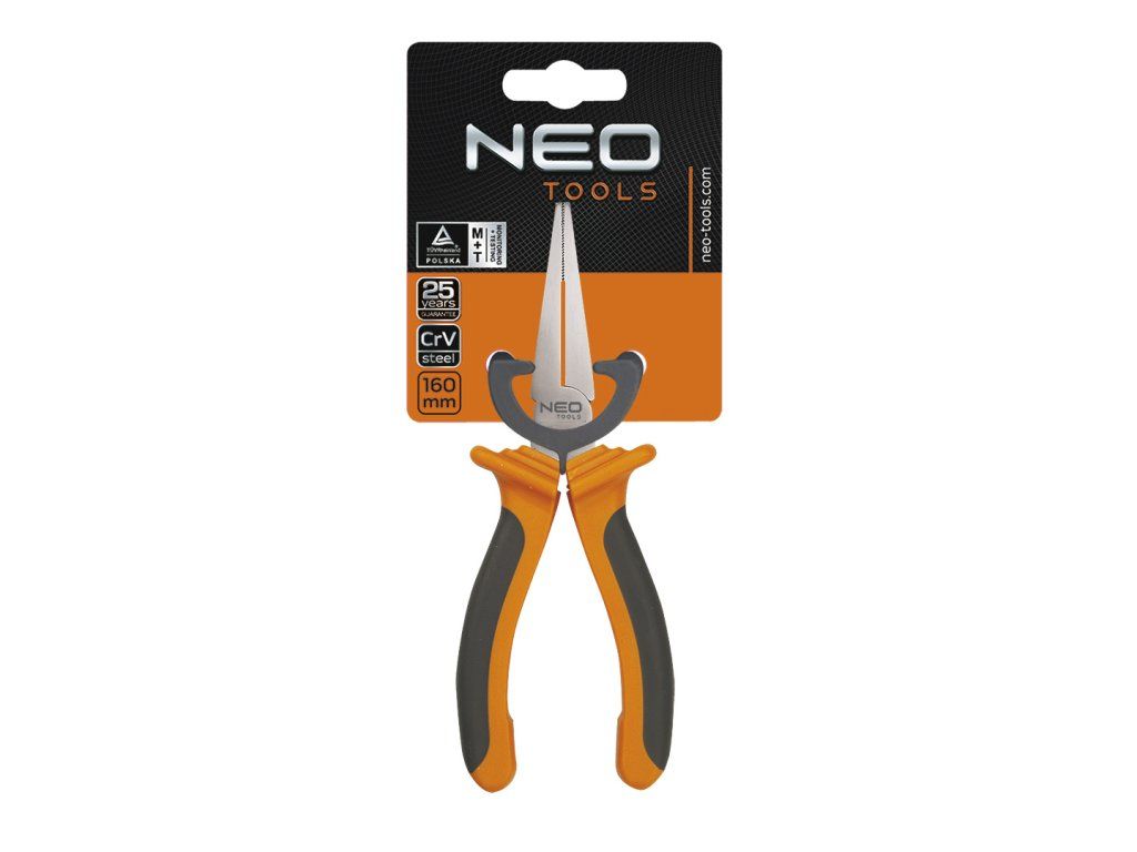 Ploché kleště NEO (ref. 01-019) 160 mm, vyrobené podle DIN5745. Čelisti z vysoce kvalitní oceli, indukčně kalené (55-60 HRC), zajišťují pevný úchop. Ergonomická rukojeť z dvojitého materiálu pro větší pohodlí. Kvalita nářadí potvrzená certifikátem TÜV a 25letou zárukou výrobce. Značka NEO splňuje očekávání profesionálů.Doplňkové parametry