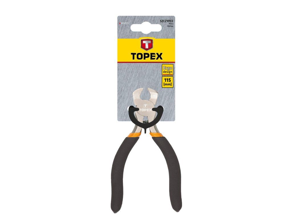 Přesné kleště TOPEX (č. 32D725) o délce 115 mm. Vyrobeno z kalené oceli, navíc s indukčně kalenými řeznými plochami. Ergonomické rukojeti pokryté protiskluzovým materiálem zajišťují pohodlí a bezpečnost při práci. Výrobek se dokonale přizpůsobí tvaru ruky. Kleště mají pružinu, která zajišťuje, že se ramena odrážejí, což zvyšuje pohodlí při práci s nástrojem. Značka TOPEX je určena pro kutily.Doplňkové parametry