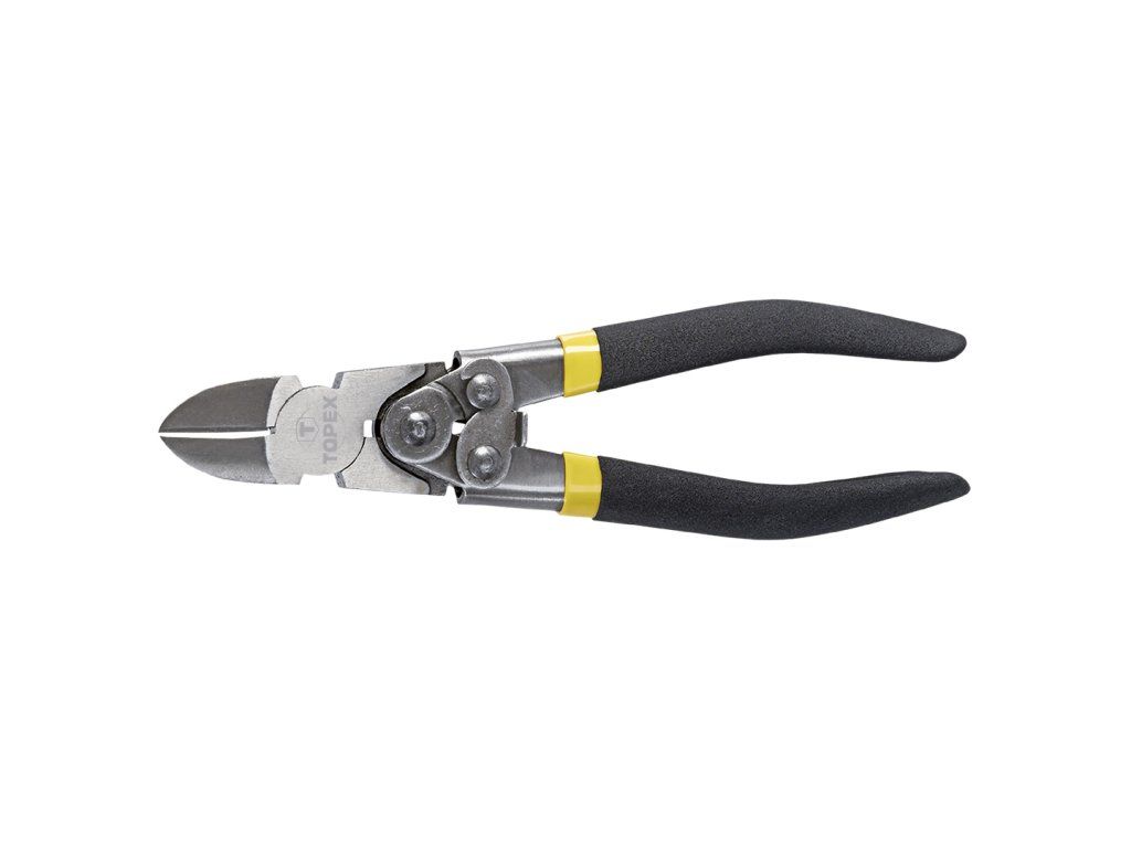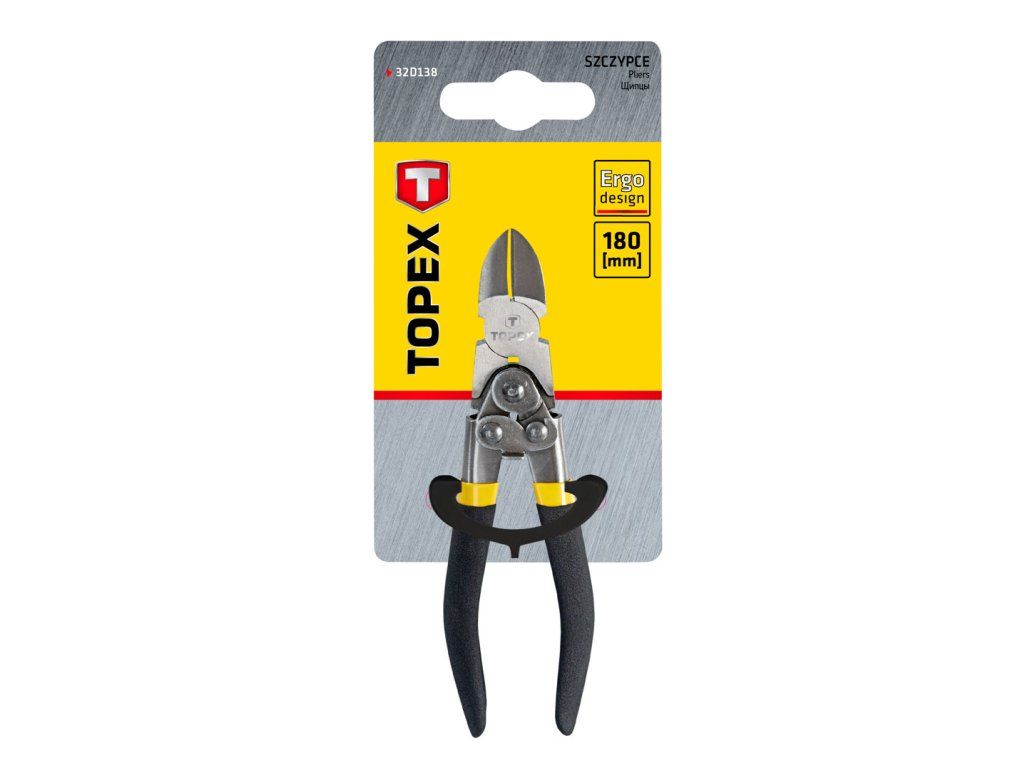 Kleště na boční spoje TOPEX (č. 32D137) 180 mm dlouhé. Kloub zvyšuje pevnost nástroje při použití menší síly. Vyrobeno z kalené oceli, navíc s indukčně kalenými řeznými plochami. Ergonomické rukojeti pokryté protiskluzovým materiálem pro pohodlí a bezpečnost při práci. Výrobek perfektně padne do ruky. Značka TOPEX je určena pro kutily.Doplňkové parametry