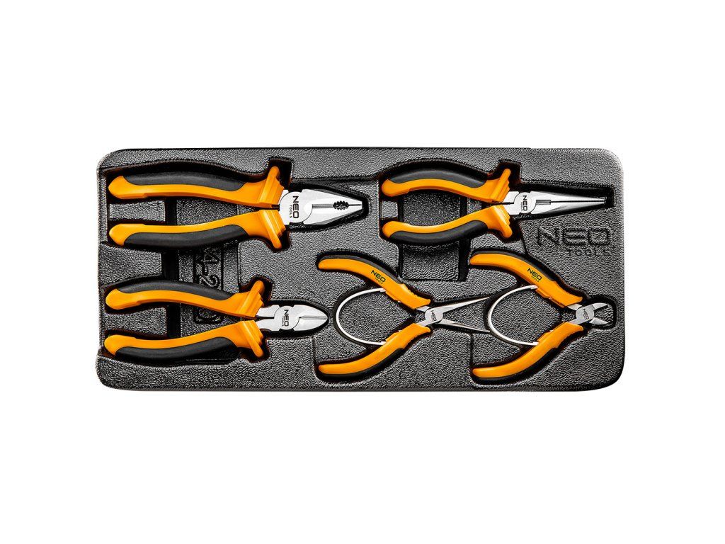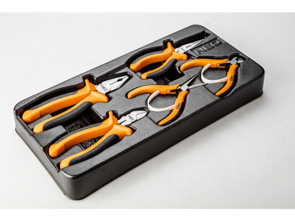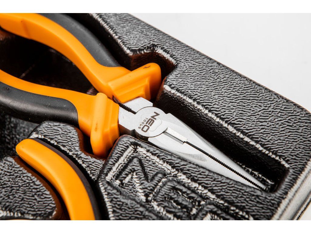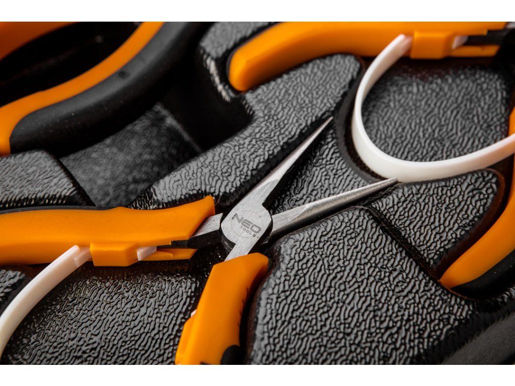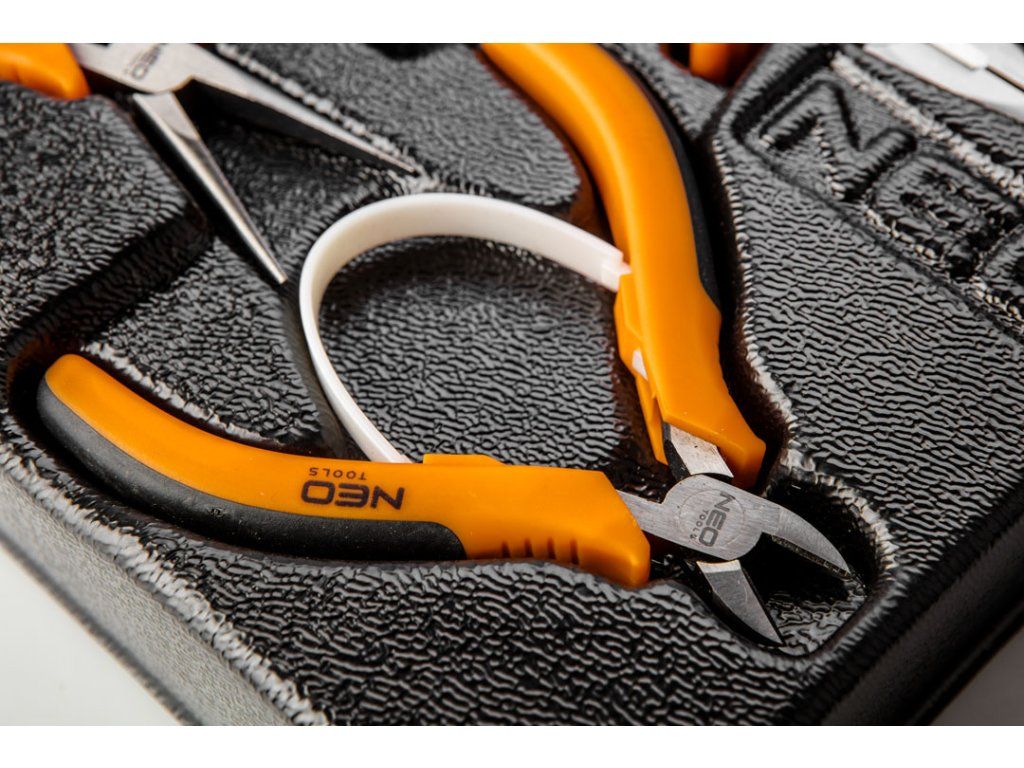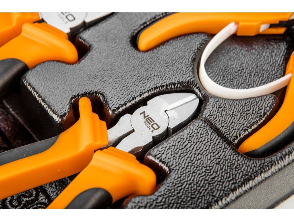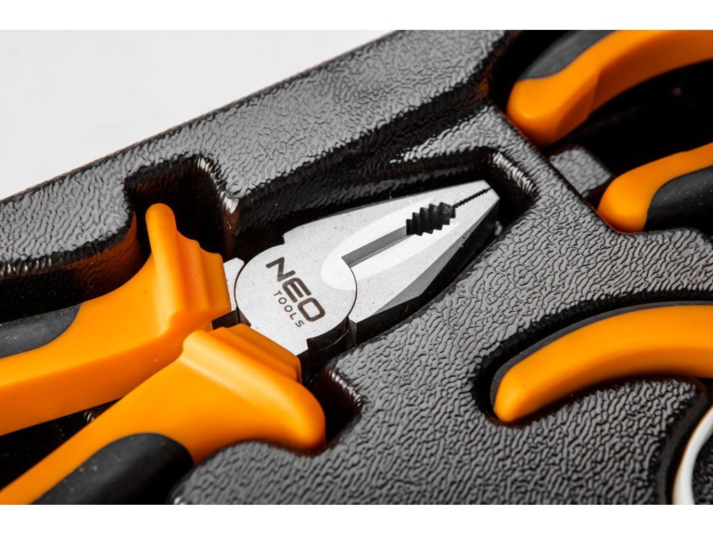 Sada 5 kusů kleští NEO (ref. 84-230), vyrobených v souladu s normami DIN. Čelisti z vysoce kvalitní indukčně kalené oceli (55-60 HRC) zajišťují efektivní řezání a tvarování tvrdých drátů. Ergonomická rukojeť ze dvou materiálů zvyšuje pohodlí při používání. Nářadí je dodáváno v praktickém plastovém lisovacím boxu, který se hodí do zásuvek skříní na nářadí NEO 84-221 a 84-222. Kvalitu nářadí potvrzuje certifikát TÜV a 25letá záruka výrobce. Značka NEO splňuje očekávání profesionálů.Doplňkové parametry