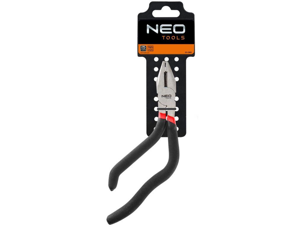 Univerzální kleště NEO (č. 01-080) mají jedinečný tvar rukojetí, který usnadňuje práci v těžko přístupných místech a zároveň zajišťuje vysoký komfort práce. Díky protiskluzovým rukojetím nástroj nevyklouzne z ruky. Čelisti z kvalitní indukčně kalené oceli zajišťují efektivní řezání a tvarování tvrdých drátů. Značka NEO splňuje očekávání profesionálů.Doplňkové parametry