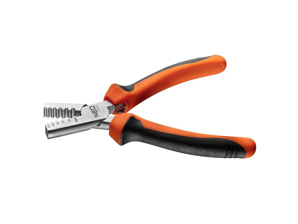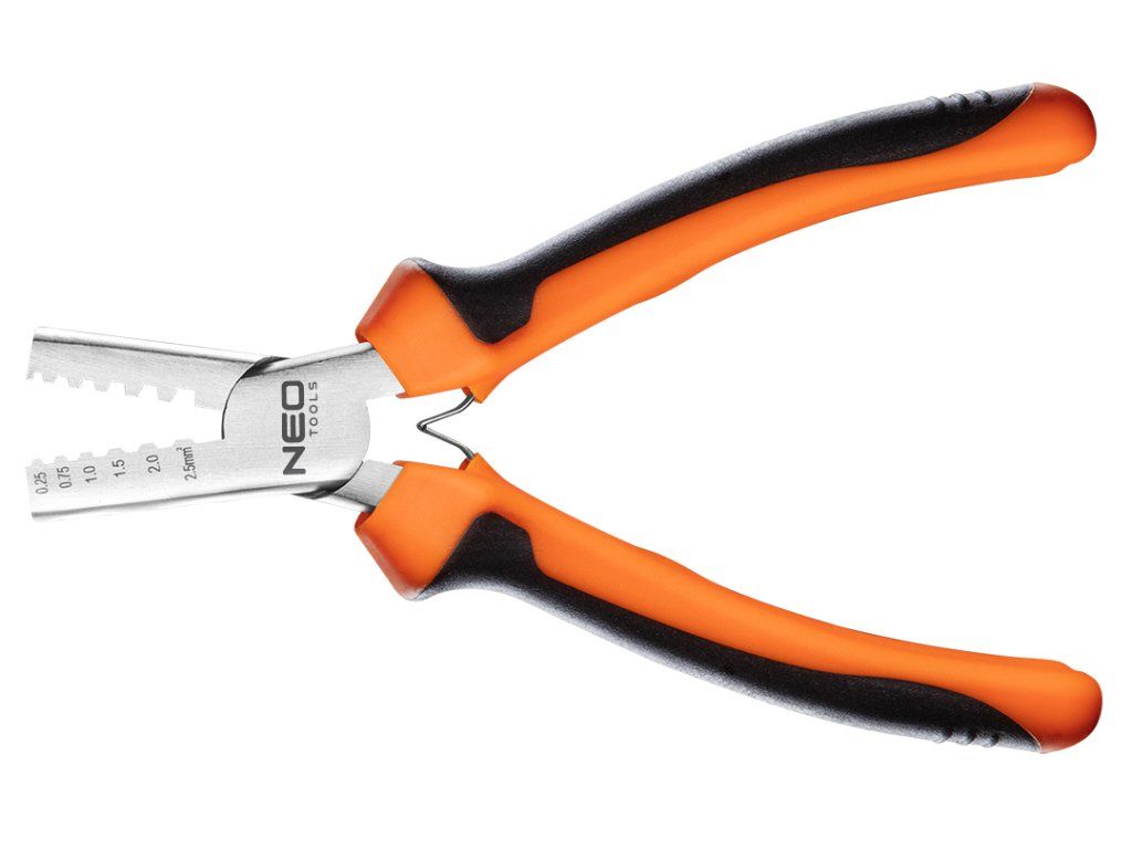 Krimpovací kleště (ref. č. 01-532) NEO délka 140 mm. Pro koncovky v rozmezí 0.25-2.5 mm² (15-9 AWG). Čelisti jsou vyrobeny z tvrzené uhlíkové oceli. Dvoukomponentní rukojeť z měkkého, neklouzavého PVC zvyšuje pohodlí při práci. Rozpínací plíšky usnadňují práci.Doplňkové parametry